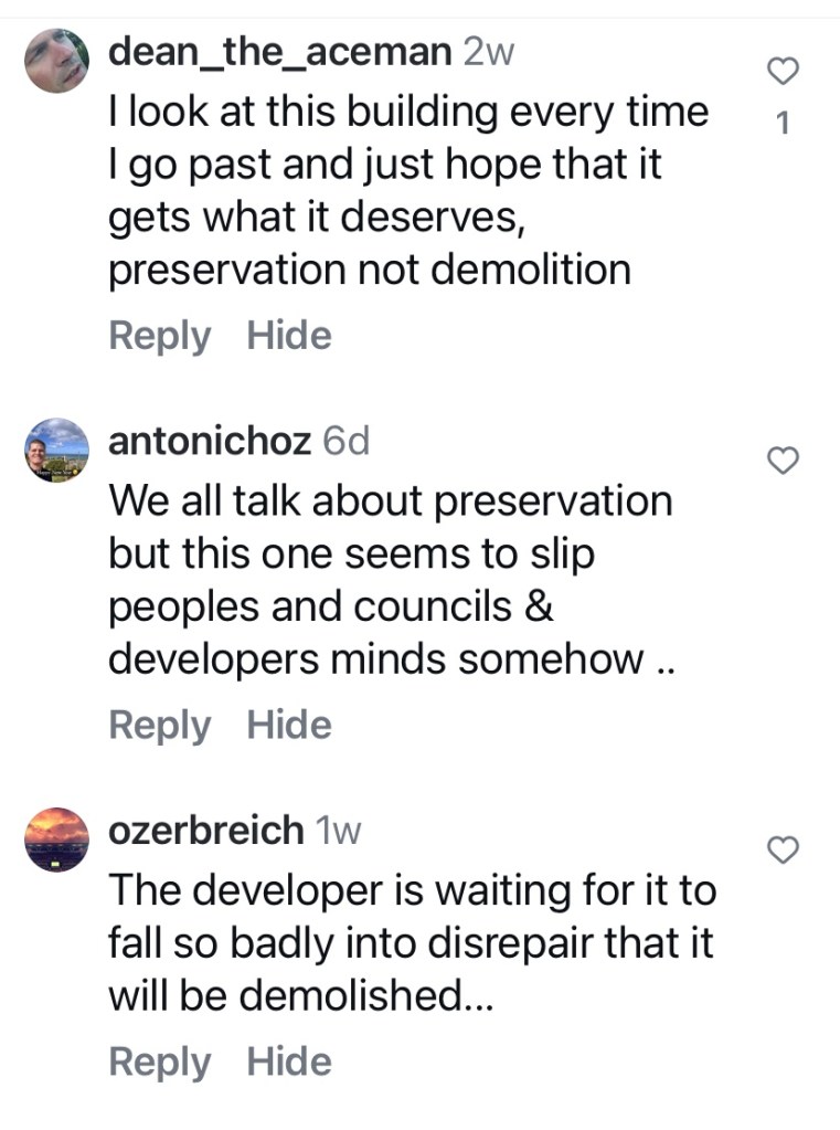 In the Age today because it’s still propped up and no repair work seems imminent. It was bought by a developer in 2021, who owns the three adjacent buildings, and says that getting permits from Heritage Victoria is hard, but meanwhile they ordered him to fix it up in August last year. There’s no comments from them, but deputy chair of the National Trust Australia Lachlan Molesworth points out that the penalties for letting something fall down arnt strong enough, which is quite right. HV have to go to VCAT I think to enforce anything, just like Councils, but even then owners can delay or just mot act. The only thing that has happened is the big old oak in the backyard was cut down a few months ago, no reason given (no tree pic @tristan_davies). There’s no reason to think the developer would be allowed to demolish part of the shop or even cantilever over it, so he might as well fix it up as a bar or something, because it’s going to remain quite separate – but yes it requires major works, probably underpinning the side wall at least.