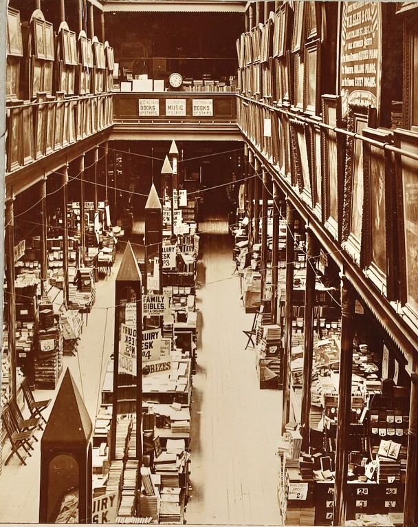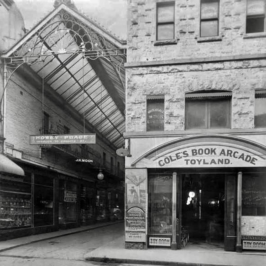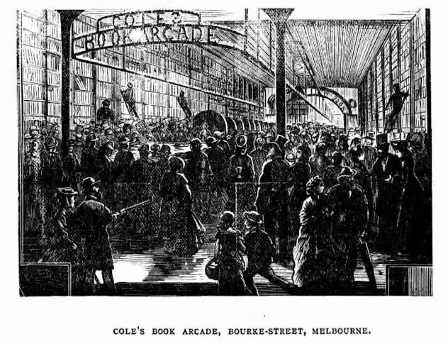 Cole started selling books a bit by accident it seems, moving on from the pies he was selling from a barrow at the Eastern Market, to a stall, to a bigger stall, and then to his first ‘arcade’ in 1873 a few doors down Bourke Street. It was a big double level space, he was always thinking bigger once he saw success, and its possible he named his shop ‘arcade’ after the rather new 1872 Eastern Arcade, which was next to the market.
