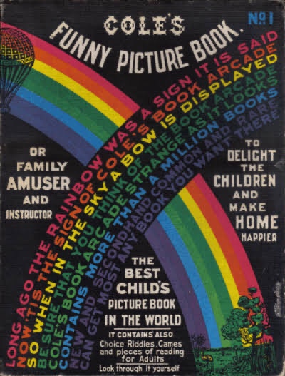 Coles Book Arcade in Bourke Street was decorated with a giant rainbow 🌈 isnt that nice? It looks like it was sculpted on, and then painted – judging from a hand coloured postcard I think it had the 7 (8?) colours of the traditional rainbow, as seen on the covers of his #ColesFunnyPictureBook, but with the darkest colours on the outside. E W Cole was not only a bookseller but promoted many utopian ideas, which the rainbow represented, such as World Federation, all religions having the same ideals, aircraft are coming (he was right!), if everyone treated others as they like to be treated, there would be no more war. All this is outlined in an excellent book published 2020, “Under the Rainbow, Life and Times of EW Cole”, miegunyahpress.
