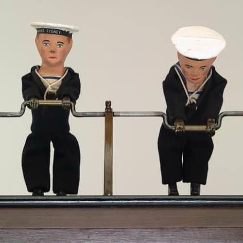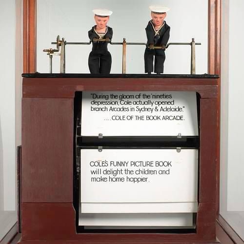Repost 2017: The ‘littlemen’ from #ColesBookArcade – I always thought they were rather #creepy. The faces are so badly made and they don’t look happy, and why sailors ?? They crank a handle to turn flip cards with ads and positive exhortations – they’ve been on display at the #MelbouneMuseum possibly since the arcade closed in 1928, and I remember them being on display as a kid in the 70s when it was still in some of the huge cavernous rooms now occupied by the State Library; press a button and they started up. The displays back then hadn’t changed for decades ! The Cole’s Finny Picture Book was first published in 1879 (!) and reprinted so much that half a million were sold, including editions in the 1950s and new versions up to 1991 (book no 4). This one is Book No 2, first published 1909. As a kid I thought the naughty boy whipping machine wasnt funny at all ! Pics of sailors, Museums Victoria, others, the internet.