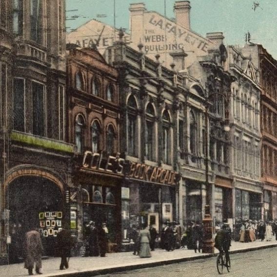 Coles Book Arcade in Bourke Street must have been a magical place – and impressive ! EW Cole opened this emporium of books in 1883, with new publications on the ground floor, second hand on the first floor (and soon added ornaments on the top floor!). He provided chairs for people to sit and read with no need to buy, an impressive innovation for the 1880s. Later he provided an aviary, monkeys, an orchestra, and extended further and further eventually to Collins Street, selling music, stationary, wholesale books, children’s books, with a fernery, a cafe and an art gallery. Some of the images here are from a Coles family album held by the @library_vic, most undated, but appear to be 1880s-1920s, others in their general collection.