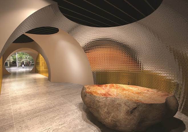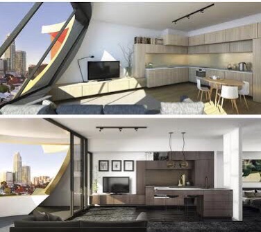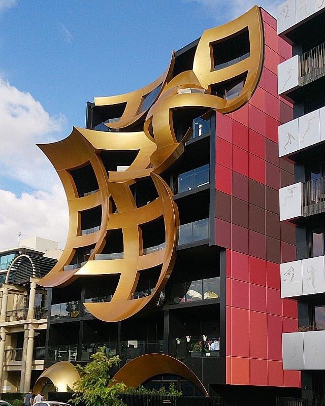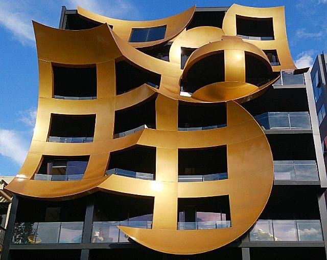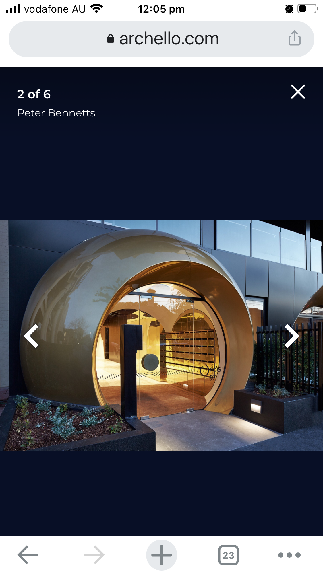 The gold #fibreglass (no it’s @shapeshift.tech an ‘advanced composite’ that does not burn) sparkles in the sun, a #surprise down what’s really a quiet side street. The architects statement says they wanted to avoid ‘placelessness’, which they’ve achieved, but then they always do. A facade made out of intersecting gold spherical portions of differing sizes (or are they the same?) will do that. Entry image @peterbbennetts, apartment interior and inside lobby @armarchitecture website.