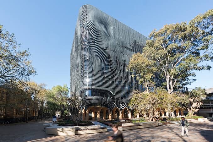 Repost this day in 2017: The ground level of #ArtsWest by @armarchitecture finished 2016 actually looks a bit #surreal. I guess it’s the unlikely #yellowochre as a kind of forest/cave/#undercroft, plus the wiggly shiny #louvres / #fins. Amazing what computers can do for you. And the fins above have patterns made by ‘impressing’ various objects from the University’s art collection into it, not that you can see from ground level, but nevermind, nice textures.