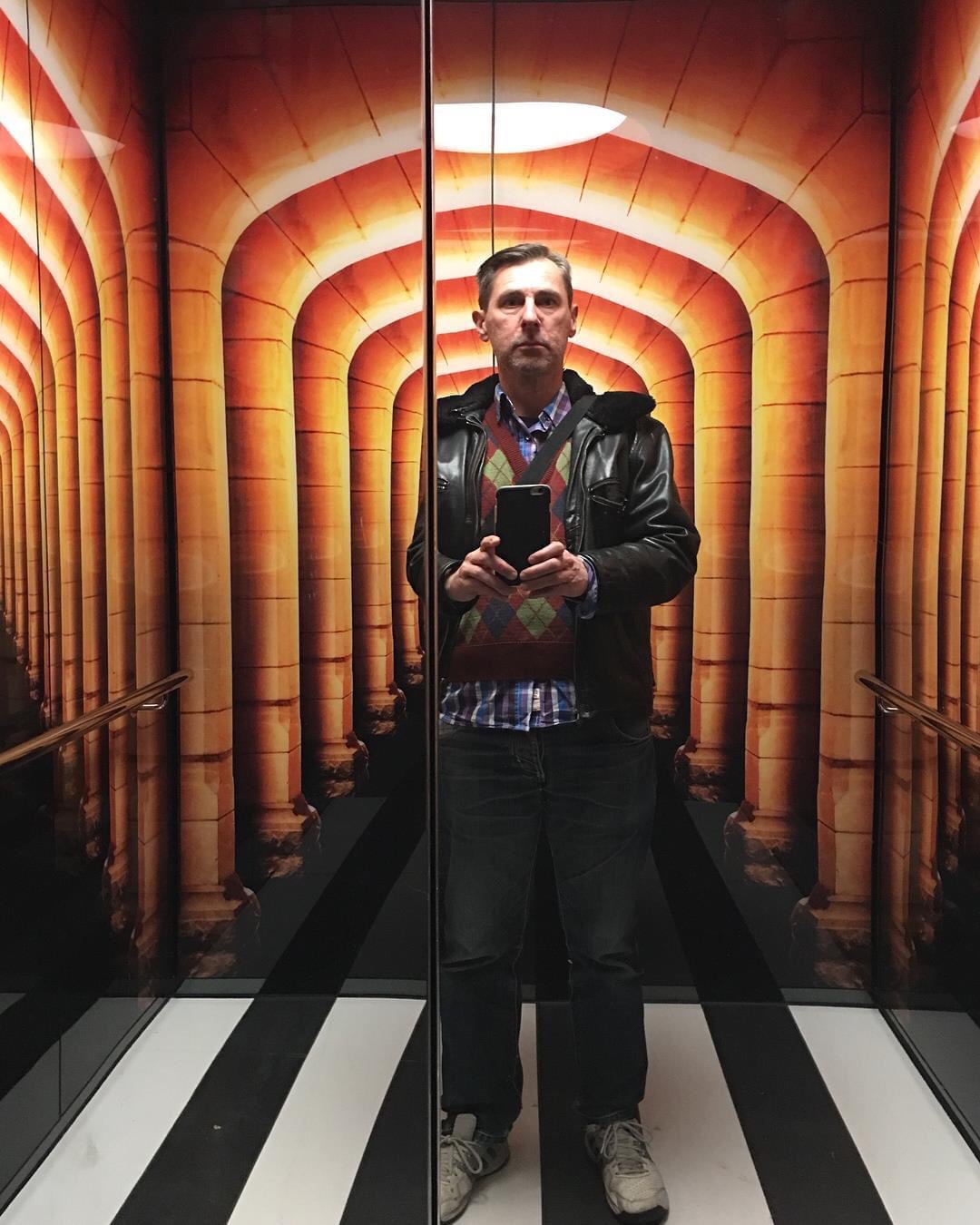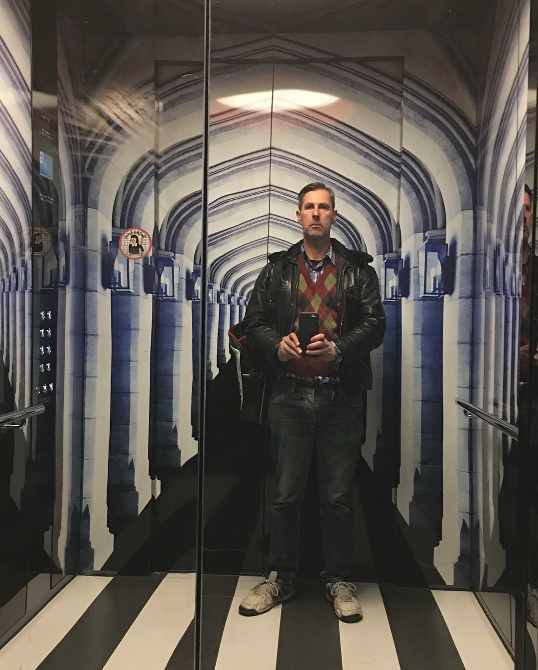 OpArt #selfie #lifts at #ArtsWest, #ARMarchitecture showing they’re true #postmodernists, referencing but transforming adjacent historical things, and putting #funpark versions of stone archways in the lifts ! @ Arts West Building