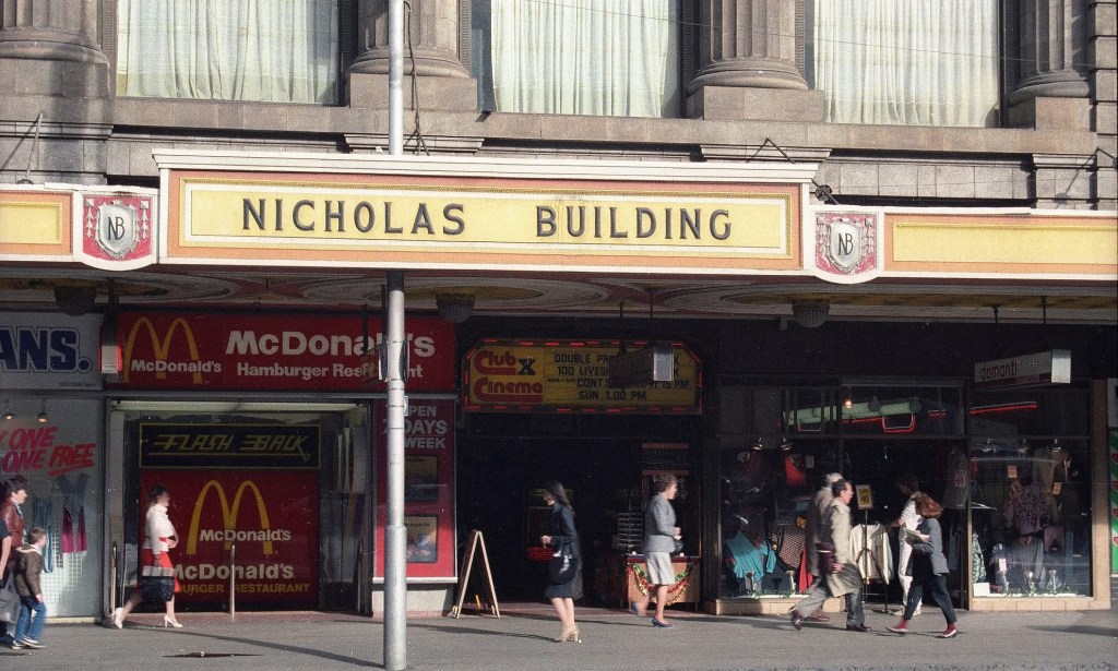 Havnt been in the Nicholas Building for ages, forgot that above the first floor the lifts are surrounded by the striking original grill walling, with the outer lift doors the same. The lifts themselves I’m sure are modern ones, but there’s some copper detailing that matches, sone later addition to complement, and I applaud the effort – but not the distracting print of the grill pattern, and there’s no need to put up photos of the building you’re already in.