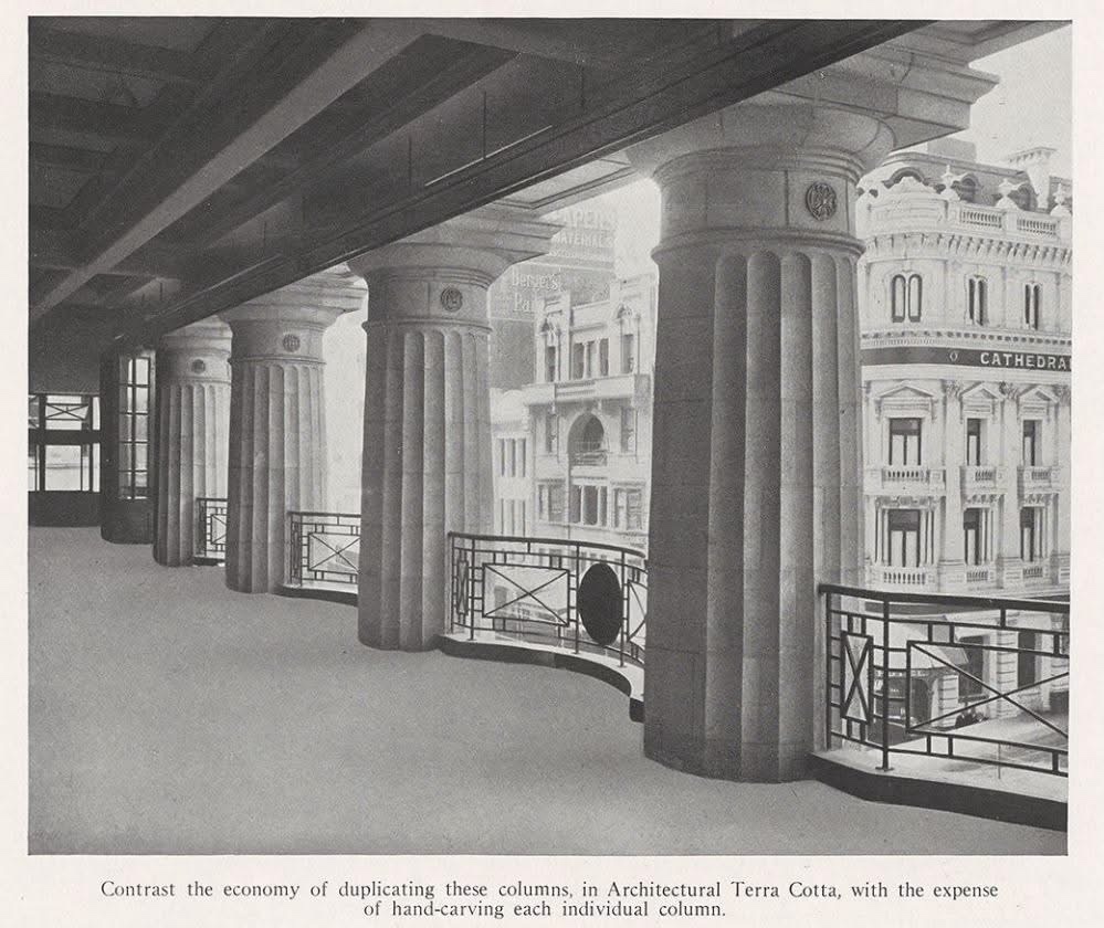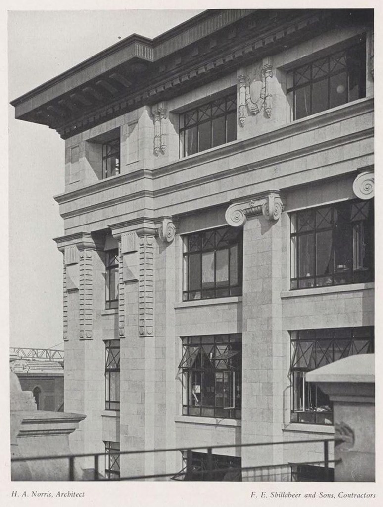 The #NicholasBuilding, #HarryNorris, 1926. Great example of #CommercialPalazzo as we call it, all #classical with #ionic #pilasters, a huge #cornice, cubic proportions (due to the #132ftheightlimit) and more great details at the base, all hidden by trees. A #verticallane, with artisans, artists, regtrade, specialist retailers, or maybe less so now that I hear they’ve put the rents up. Grey #faïence, a type of #terracotta, made to look like stone (but cheaper and easier !). Nicely sculpted #ioniccapitals and decoration between the #attic windows. All steel framed windows. Huge cornice.