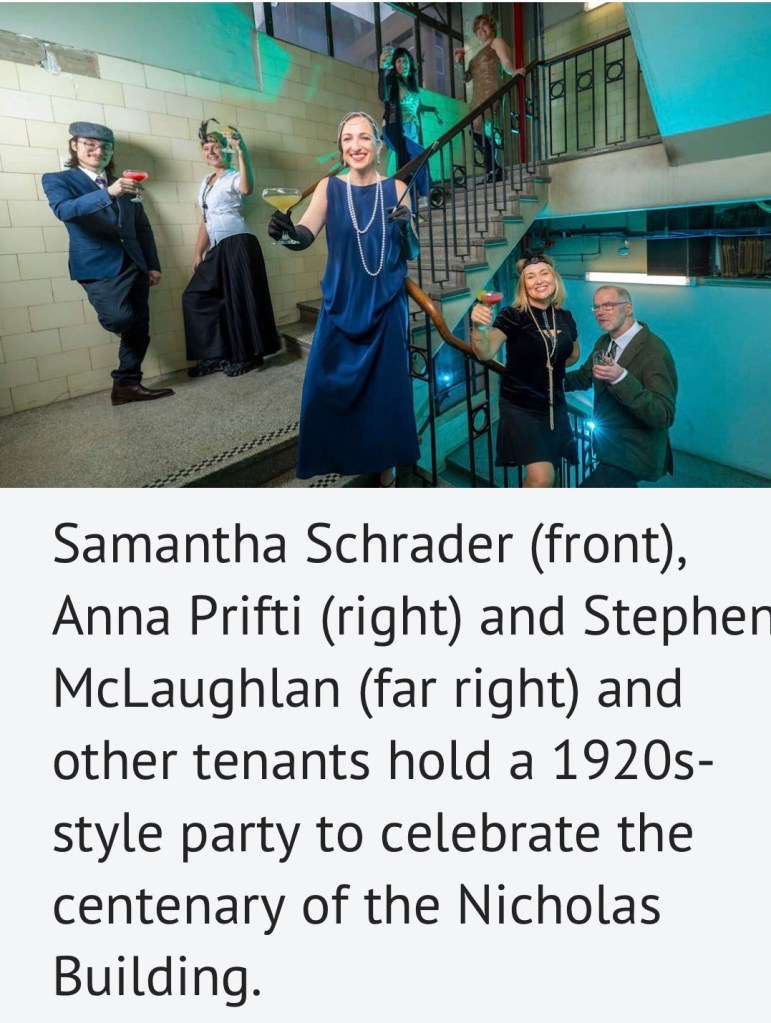 Last month on the 12th March, the Nicholas Building celebrated its centenary, so here’s a bunch of old photos found on facebook, more or less in date order, with mine from 2015-18 at the end. Some tenants got together last Friday to celebrate, dressed up 20s style, 2nd last pic. I’m still not used to 1920s places being a hundred years old ! Also, it hasn’t sold.