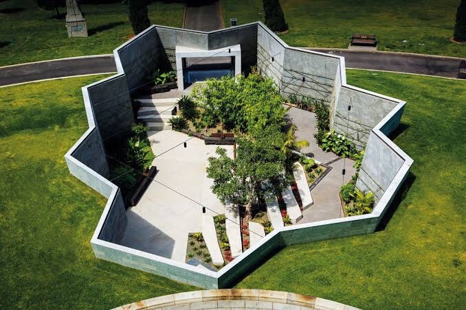 The Shrine is a curious monument, architecturally, a stepped pyramid with the front of the Parthenon attached, in granite where some blocks stained with rust – BUT the courtyards are great – such a smart solution putting them in the corners. Back in about 2000 they were thinking of accessing the space under the the building, since it was built on huge brick columns, an extra artificial hill on top of the hill, at first via face-on entries on the north side, terrible idea. Then @ARMarchitecture came up with the diagonal courts cut into the (artificial) hill, both a lot more space and less intrusion, and great new views of the bldg too. I think they were inspired by the diagonal elements in the original design, never built. They were built in two stages, 2003 + 2012. The zigzags maybe meant to evoke army trenches, but ARM just like zigzags too. Each one has a different character and references, and you can tell what they are straight away; one is just trenches, another like a Malay jungle, another like Gallipoli and the fourth like a huge memorial. And they all angle inwards too, I think following the Parthenon-like vertical vanishing point of the shrine itself. Some photos mine, the better shots randomly found on the internet.