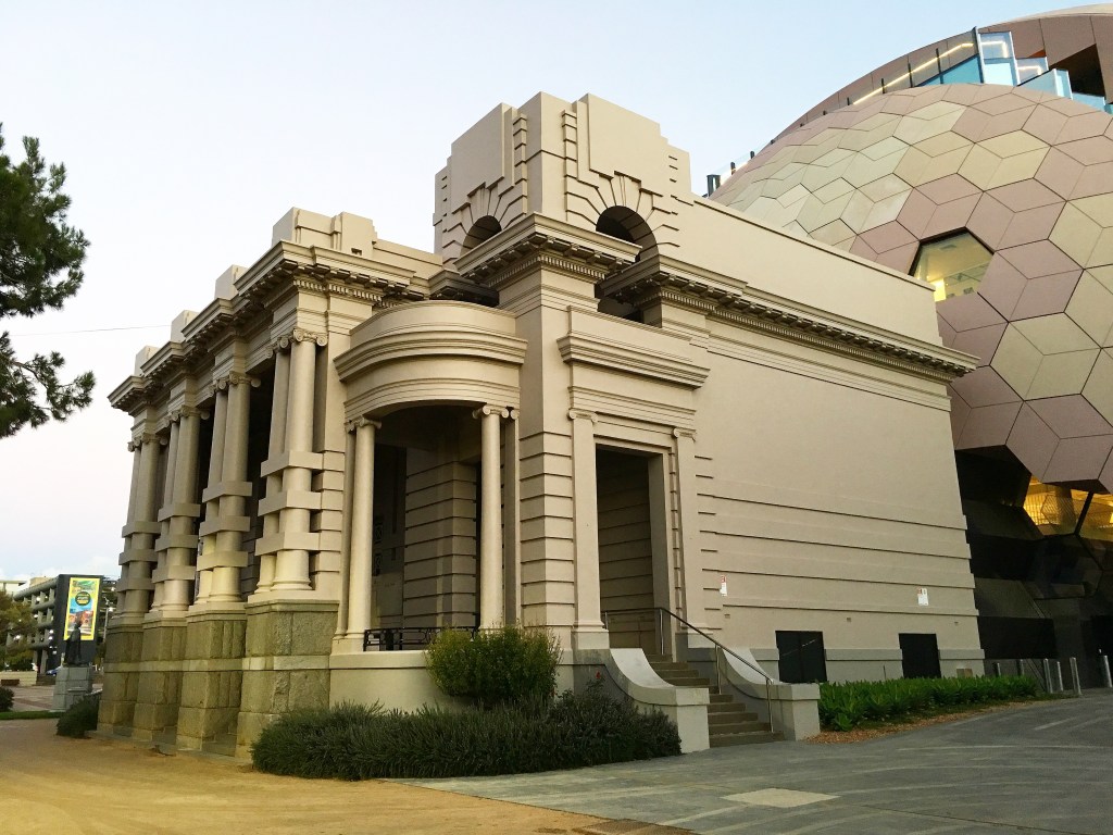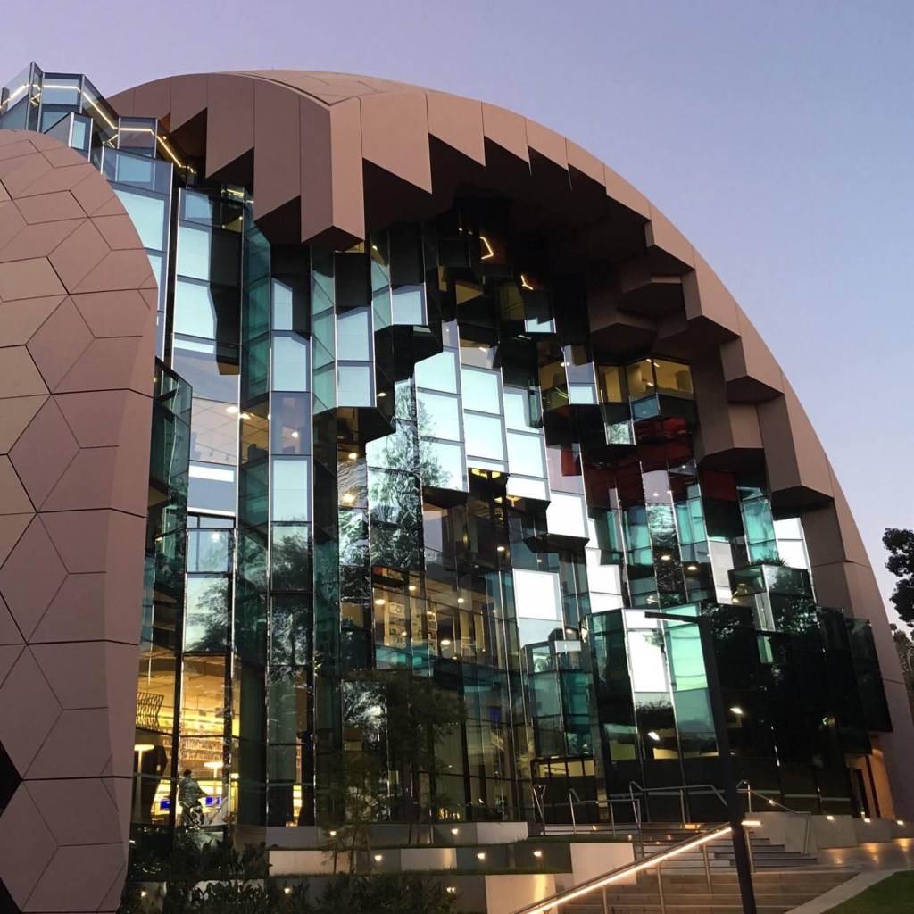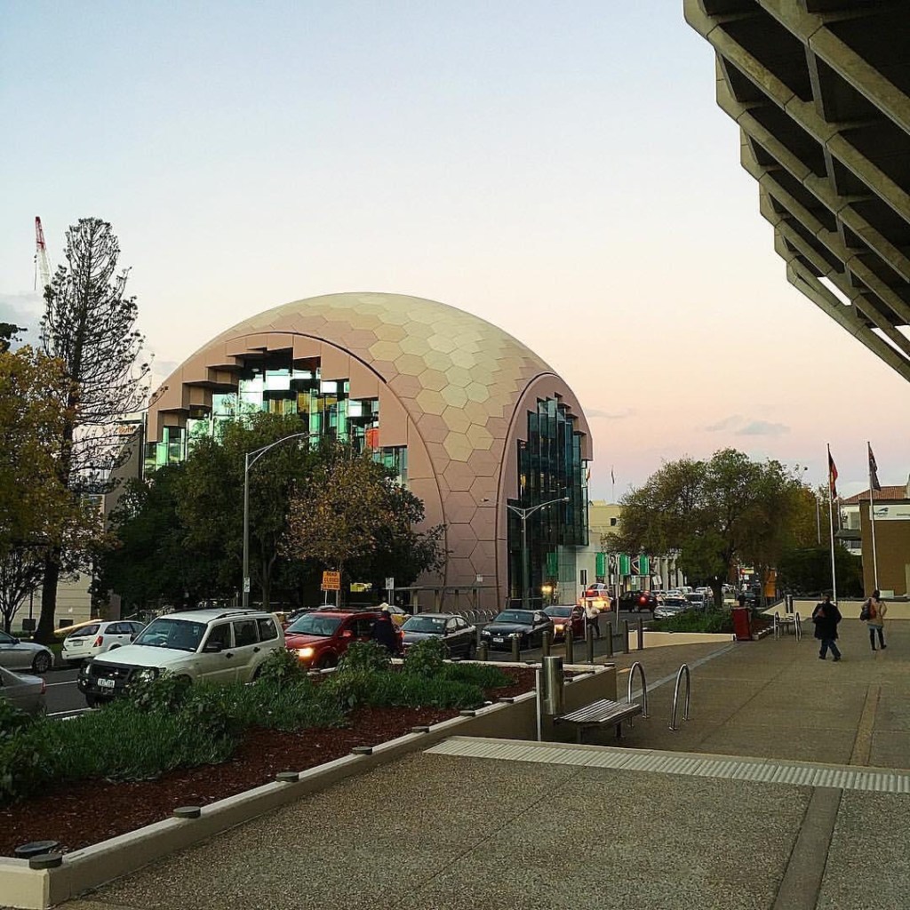 The #GeelongRegionalLibrary west side in the last rays of sunlight – fantastic sparkle. Definitely a #crystalline #grotto, shades of griffins capitol theatre perhaps, or the sparkle of thought within the #bigbrain. It’s a #dome with #geodesic panels but it’s not a #geodesicdome (I think). Actually not a dome but a #sphere, cut away on three sides. Monument but not. Soooo #postmodern. Very #ARMarchitecture.