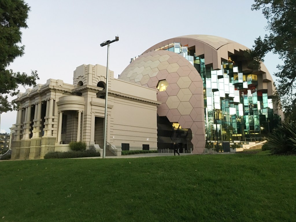 I was afraid the #GeelongLibrary would dominate the #GeelongPeaceMemorial Foyer, but somehow it doesn’t. I’ve think the unusual #spherical design references library domes and brains, but also allows for a large five floor building that doesn’t look like one.