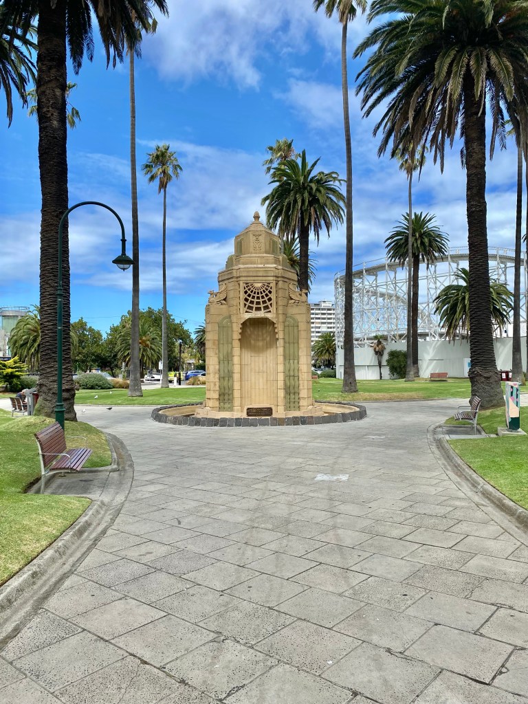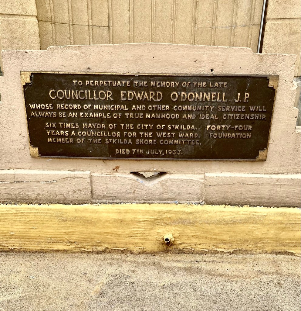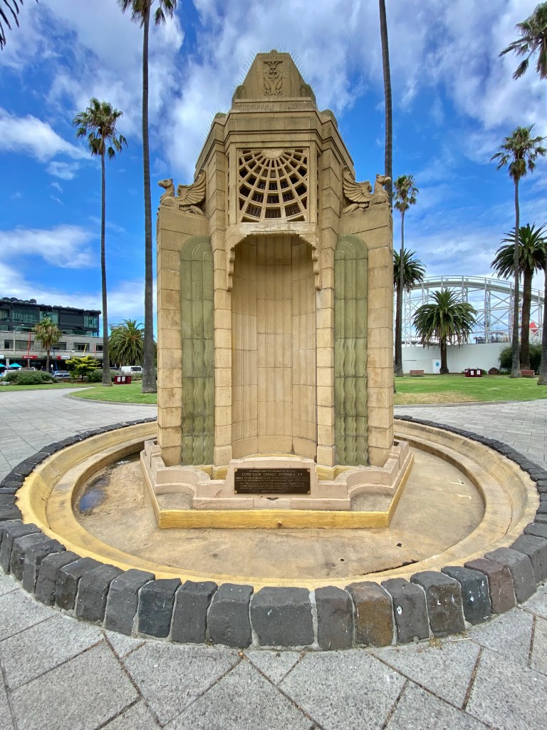 The #ArtDeco #rocket of the 1935 #O’DonnellFountain, in the O’Donnell Gardens, both named after Edward O’Donnell, a St Kilda resident and grocer from the 1850s, then councillor from 1888 for forty-four years, and six times Mayor. He died in 1933, and enough people liked him enough to raise the £750 to build this, which is nice. It’s made of sandstone, and designed and built by Modern Art Co. Info from St Kilda Historical Society, photo of him@from 1889, and of the gardens c1930 Port Phillip Heritage Collection. I must say if it’s a fountain, I’ve never seen water flow; it’s also called a drinking fountain, but I don’t see how you’d drink from it. Photos from March 2023.