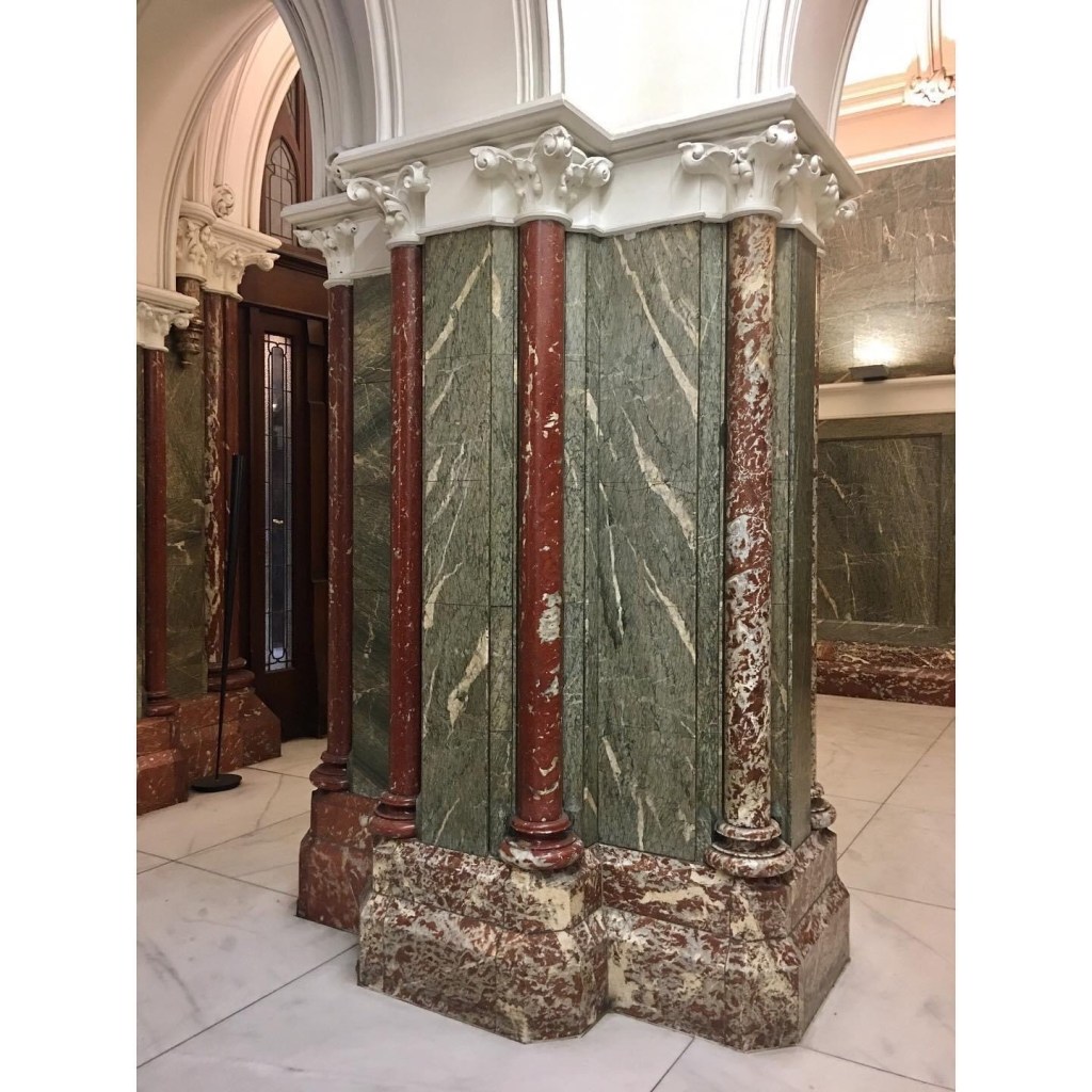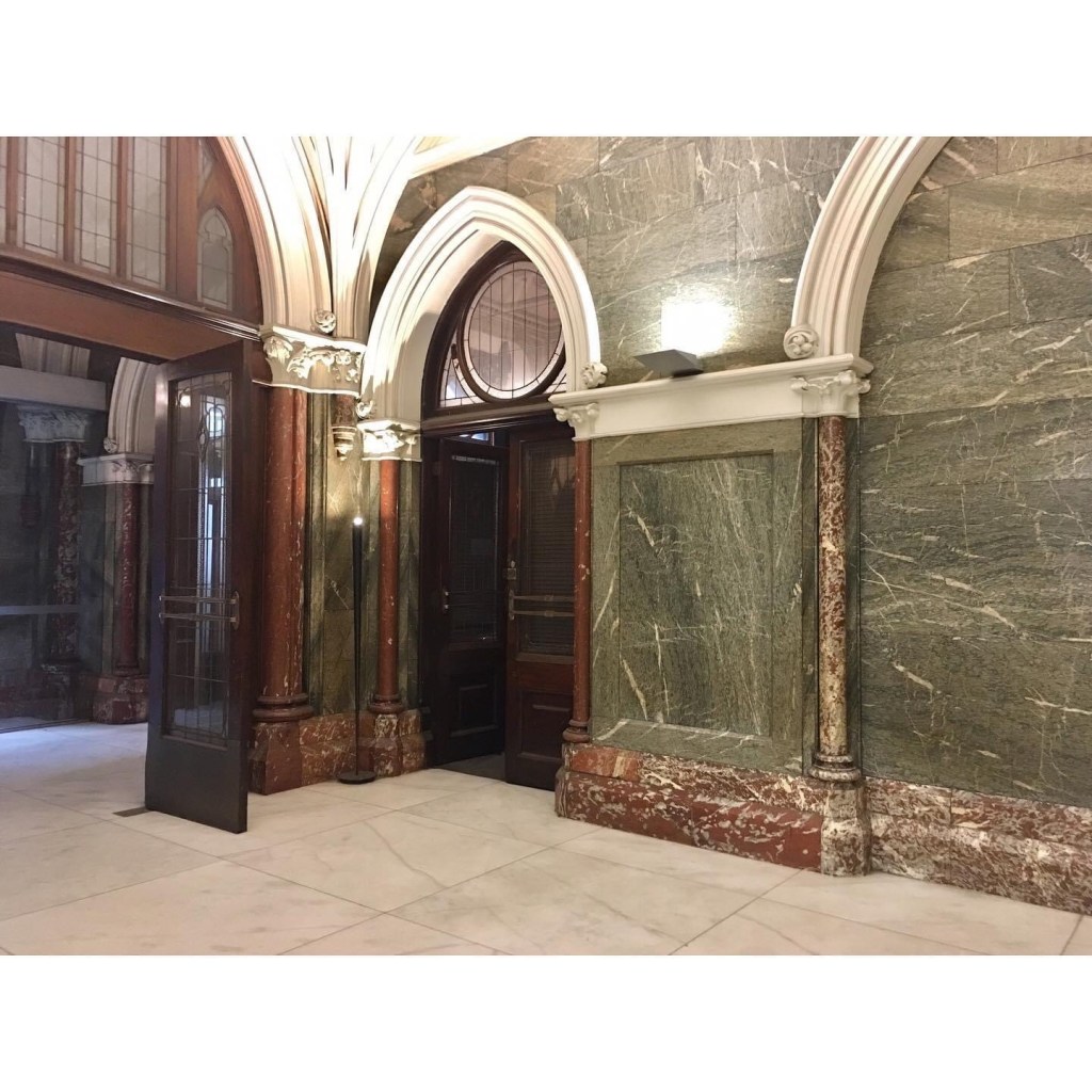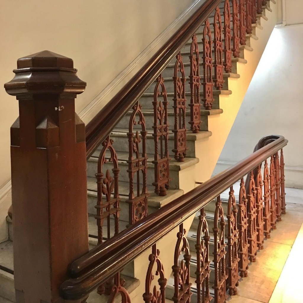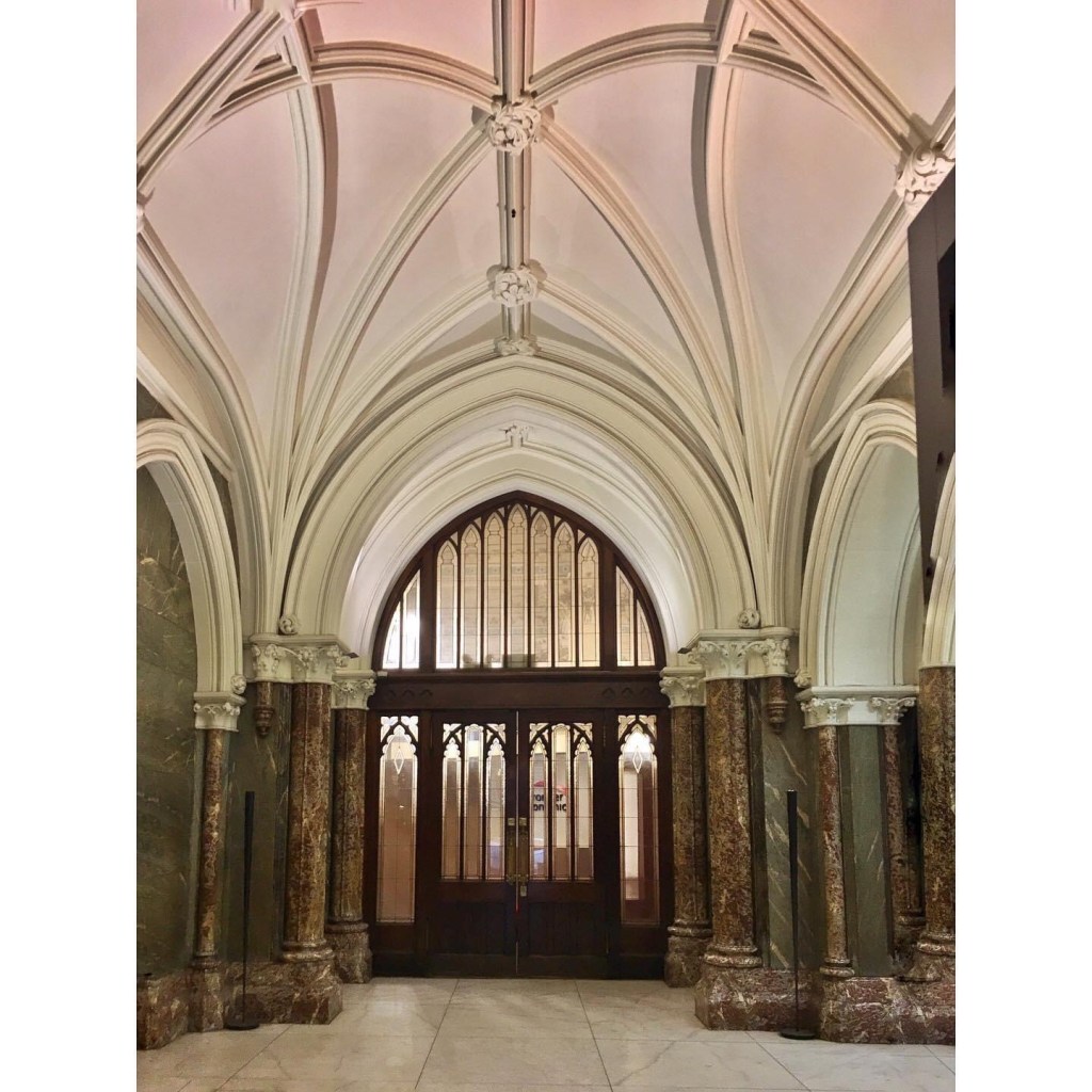The fantastic Gothic lobby of the first #NationalMutualBuilding (lately a BNZ) on the corner of Collins & Queen – designed by #WrightReedAndBeaver from Adelaide who won a competition, and it was completed in 1893, just in time for the big crash. The building was extended in matching style to the south in 1908, and I think the back half of this vaulted room is also an addition, which would explain why the vault is rectangular, not square, and why the red marble is different. Nice to see the original stair still there too, bluestone and cast iron up all 7 floors. Beaver came over to supervise the building and stayed, later forming a partnership with #ArthurPurnell in the 1910s.