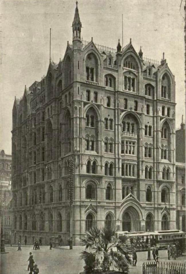 At 8 levels (130ft) it’s one of the two surviving #melbourne #VictorianSkyscrapers, the other is Stalbridge Chambers (last pic). Unusual application of the #gothicrevival to a tall building by Wright, Reed and Beaver from Adelaide, who struggled I think with the proportions, with the top three floors almost plonked on top of the rest. It does have a great skyline, but the tower/spire thing a bit tiny.
