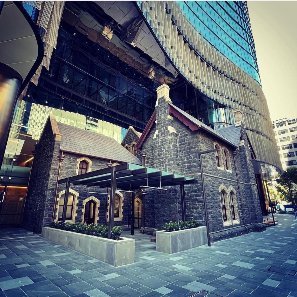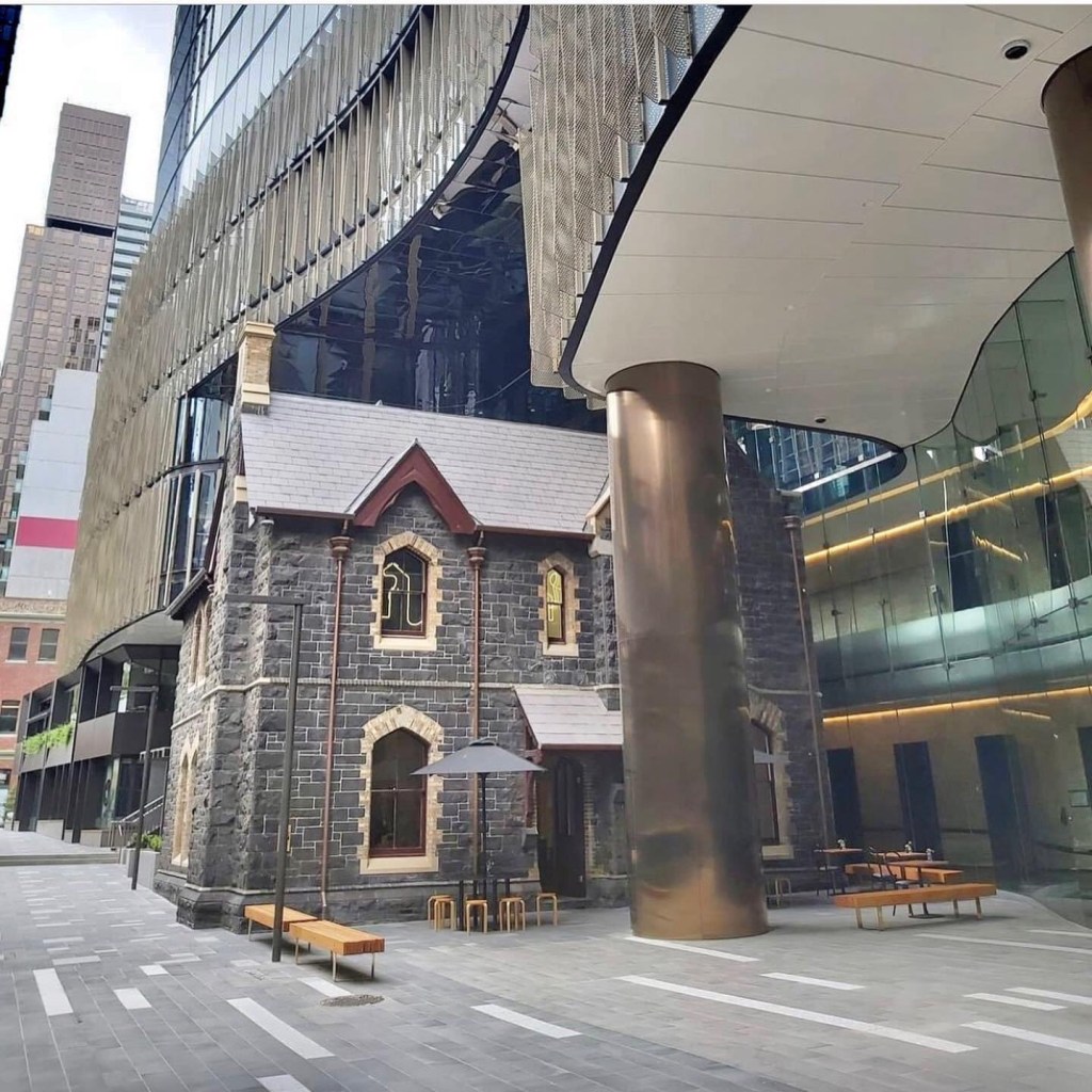 This looks about as bad as I thought it would – the 1859 manse next to the #WesleyChurchMelbourne more or less engulfed by the giant office tower just completed around it. Part of a very unsatisfactory compromise, sacrificing the (very dilapidated) #PrincessMaryClub, and allowing this, in order that the church got $5mill for restoration works, and $1mill /year ground rent. I’d have preferred no tower, and the #UnitingChurch maybe let go of the site completely (they’ve also go St Michaels after all) and maybe it was a different denomination or better yet a concert hall (but nobody was going to pay for that) or maybe a foodie venue ? Or perhaps at least if they’d moved the manse backwards like I suggested (sketch), it would be facing the other old buildings back there, around a nice courtyard, and at least from the front still have sky behind it. Note I havnt seen it myself, these photos, with permission, from @while.i.was.wading, @cristinaz13, the_nathanuelle_adventure, and @armitagejones.