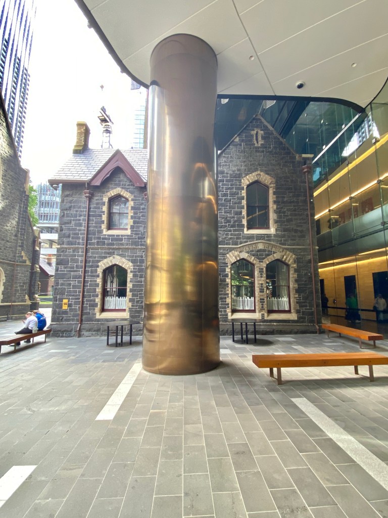 Finally got see it for myself and yep it’s terrible. This is the manse, built in 1859 for the adjacent Wesley Church, completed in 1858, both designed by the great Joseph Reed in rugged bluestone Gothic. The tower proposed in 2015 basically maximises floor space by curving in around it, then curving outwards above until the wall is flat, but neither nearly enough, the poor thing still looks overwhelmed, not to mention that damned gold column right in front. I did a sketch plan of something that might have been better, moving the manse back and out a bit, where it would be nearer the other Gothic church buildings behind. Burra Charter says don’t move anything, but also that an ‘appropriate visual setting’ should be retained. The building was a bar/cafe when the whole thing was finished in 2021; that closed and it recently reopened as a restaurant called Reed House. Side note : when I was there a family from New Zealand wandered in from the rear and they all went ‘wow look at that, they built right over it’ and I guess it is amazing, but that doesn’t make it good. But it does look better from behind.