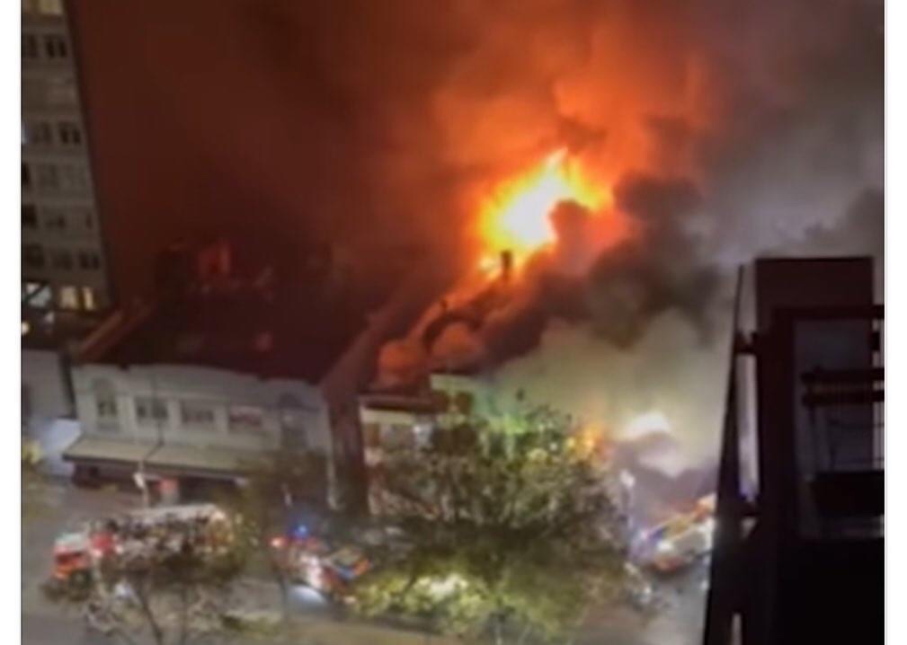 Big fire at the long closed Goldfinger’s on Lonsdale Street – the corner is the 1915 Kilkenny Inn, of which one room depth on each side was to be kept as part of an approved office development. Being a ridiculous optimist, it looks to me like the fire was well behind, with no blackened smoke marks on the corner section. Pretty sure at least the facade is safe, and the leadlight windows still there. The decorative plaster work in the first floor corner room might be destroyed by water though. And this was going to be the first example of better than facadism, keeping more than just the front walls ! First image The Age.