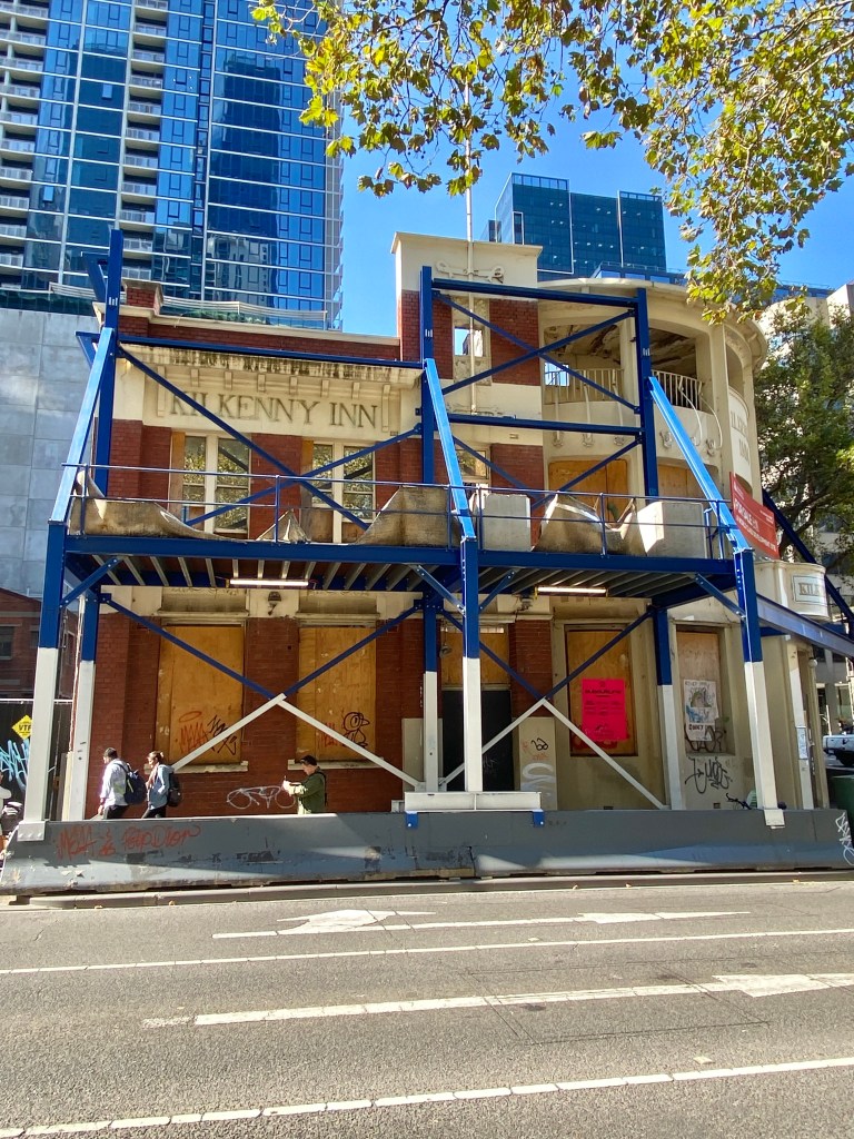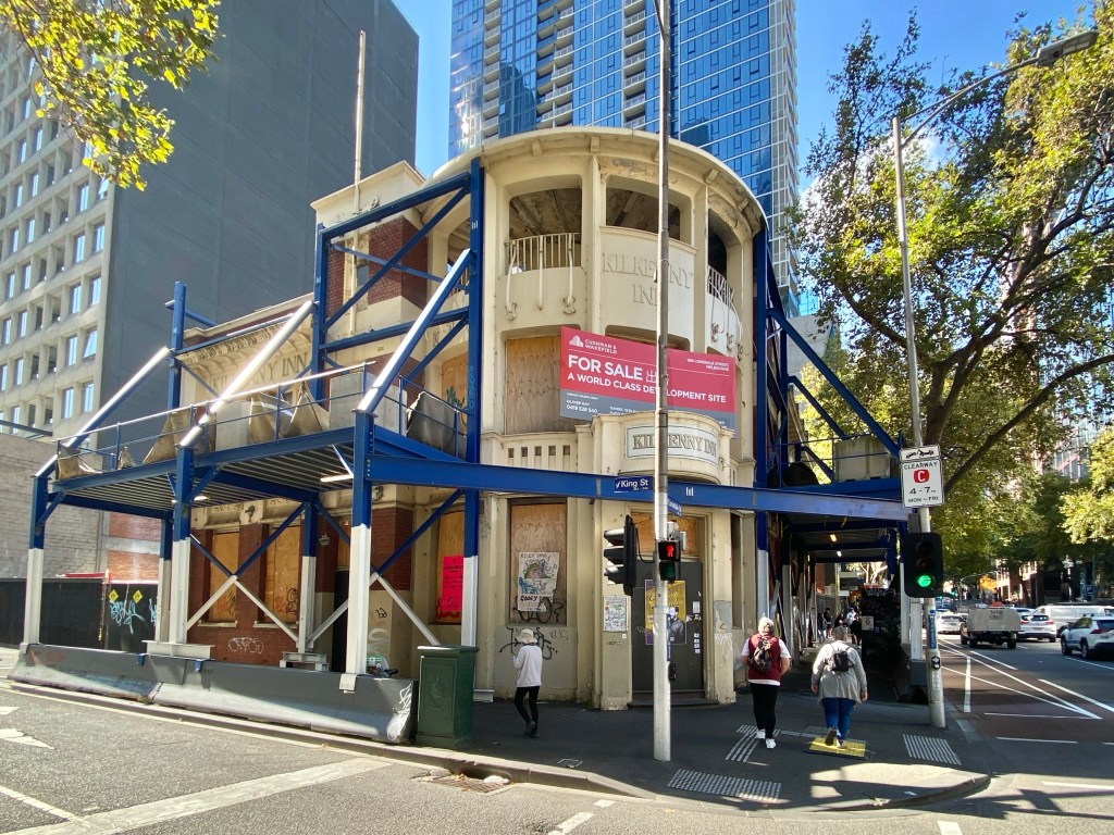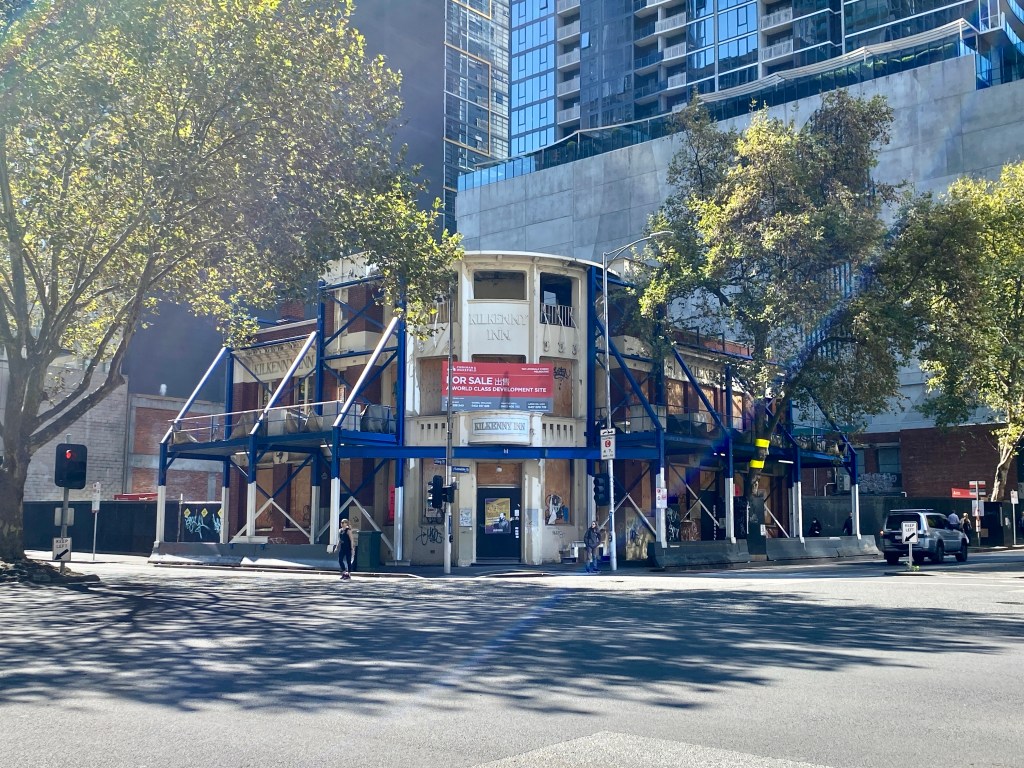 Poor old Kilkenny Inn was in the Age today, with the @cityofmelbourne asking owners Hickory to create a park, since they’ve given up on / havnt started their approved office building after clearing the site in late 2022. That was also after a fire, which was described as having gutted the building, which I think was mostly in next door, but lots of black smoke damage. It’s also reported as ‘just a facade’ but from what I can tell, poking around there, they’ve only demolished a bit more than originally permitted as per sketch plan – the corner room, which has/had notable decorative plaster upstairs, is still there. The northern wall on the King Street side has however gone. So I’d much rather they were asked to fix up the building, maybe a temporary pub ? The proposed tower was also setback behind the L shaped retained portion, so actually this was a much better design than just keeping two walls and then going virtually straight up, which newish guidelines would not allow now. My photos from last month.