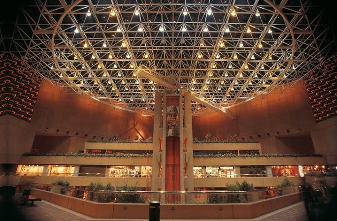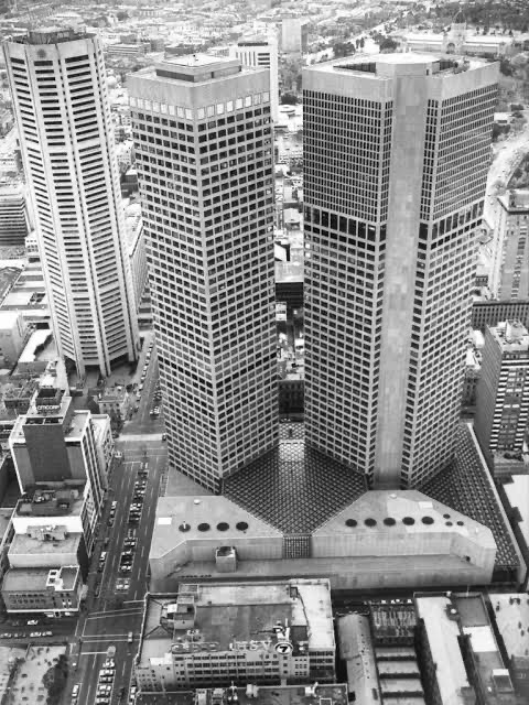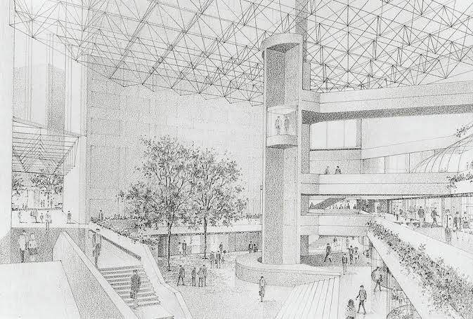 Generally considered #IMPei’s gift to #Melbourne, the #twintowered, #citywithinacity #CollinsPlace, initial design prob c1970, ANZ tower finished 1978, the hotel tower in 1981. Seems not Pei himself though, since the #PeiCobbFreed website has a CV for #HenryCobb listing it as his, and he did the big towers it seems, but let Pei take all the credit! But a lot of Pei hallmarks, like sharp angles and bold massing. Not the best thing they ever did, and not all that liked here either, though the ‘great space’ shopping atrium is very nice. Found a nice photo of the weird glittery hanging in the hotel atrium; also the sketch design of the great space, and a photo from before they covered everything with grey metal, and a photo of the space frame I took in 2013 via Facebook (!). I remember seeing it go up from the trains eternally stopping in the jolimont railyards in the 70s.
