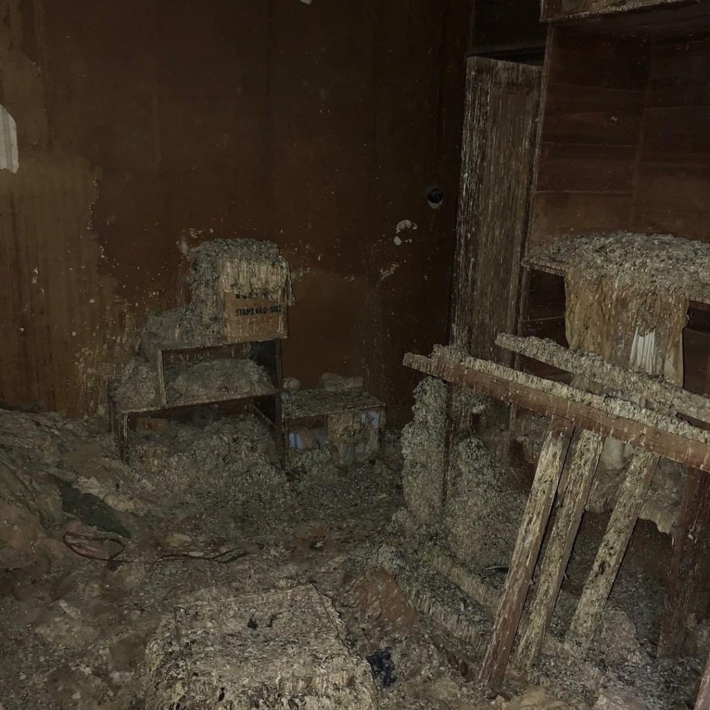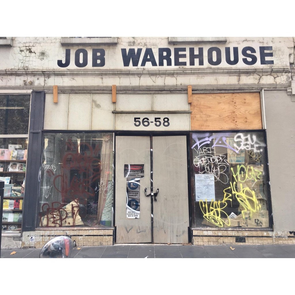 Having been various shops, in the 1950s the Zeimer brothers Max and Jacob started a fabric business in the eastern part, the name (probably) coming from their practice of buying job lots, or maybe Jobs was a special term for the theatre costumers who relied on their stock. They had arrived in Melbourne in 1948 as Polish refugees, the only survivors of their family. The brothers ran it for many decades, by the 1980s becoming famous for their gruff manner, to the point of throwing people out if they didnt look serious (‘no touching with the hands’), as well as the huge piles of fabrics, odds and ends, much of it moldering away and forgotten. By then they owned the whole building and also one down Crossley Street (named after the butcher). Max died in 1988, and Jacob in 2005, his son David finally closing the store in 2013. Only now have the insides been cleaned out – check out the #pigeonpoo in one of the rooms !