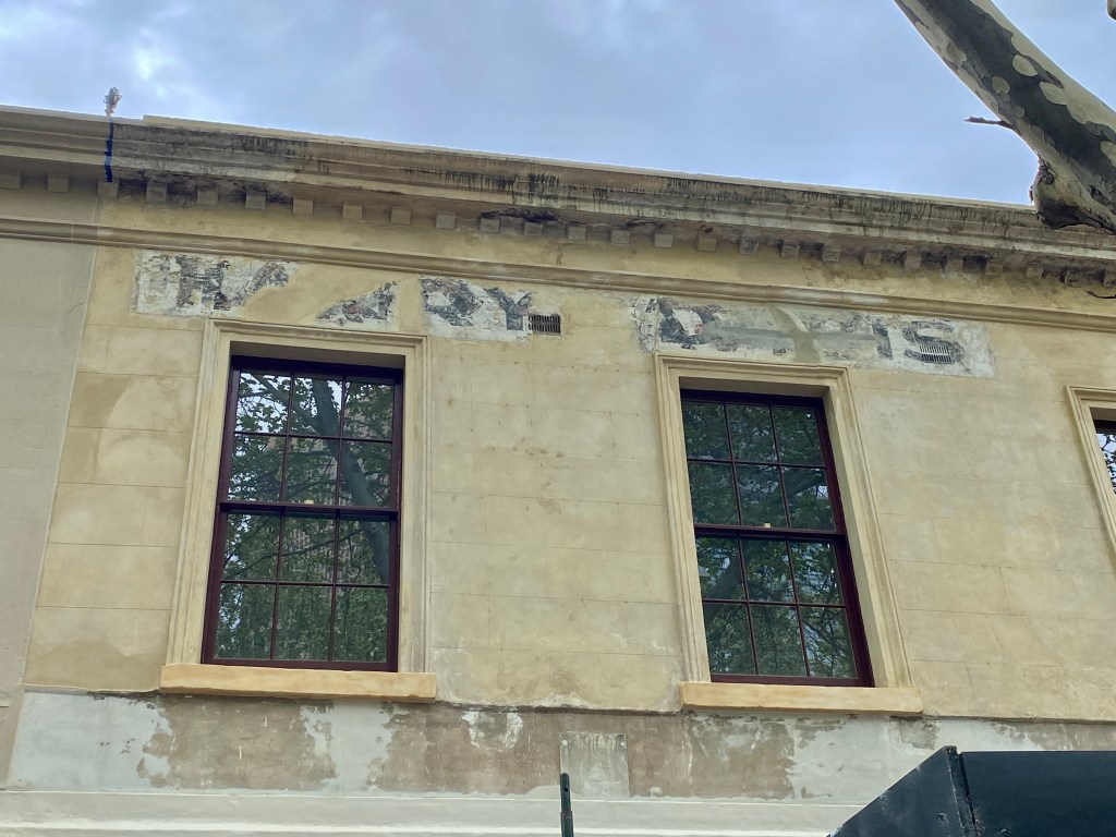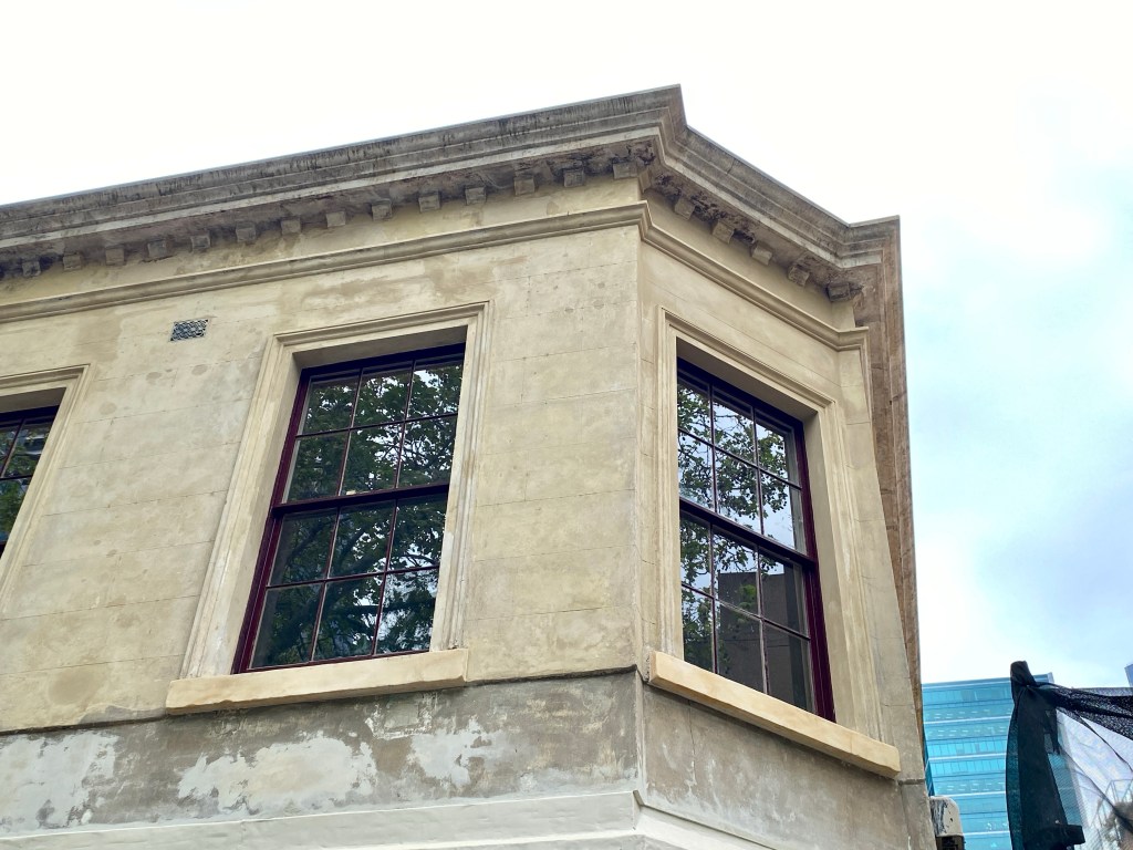 The works have also revealed the different stages of construction – the downhill half was built in 1848, and the walls are plainer than the other part, built in 1855 with more elegant details, such as the lines imitating stone blocks. The shop fronts are all 1920s/30s capper framed and tiles, which are being restored.