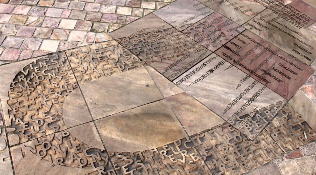 “The pink and beige sandstone, all from the Kimberley, is called “Nearamnew”, designed by Melbourne academic and author Paul Carter in collaboration with Lab architecture studio. The title, like the artwork, is an amalgam of meanings and layers, representing the many histories and peoples that go together to make the Federation of Australia. ‘Nearamnew’ was what some colonists thought the local Woiwurrung called this location, but can also be read as the english words near-am-new; the overall pattern is a huge whorl, that might be an eddy of the once swampy Yarra, or a giant fingerprint. There are 9 ‘ground figures/vision texts’, patches of carved letters, scattered across the plaza, each a literal and metaphorical layering of meaning, combining letters of the overall name, and fragments of historical and contemporary texts, not meant to be read, but as a ‘creative catalyst of movement’, ‘walking in the footsteps of the many who have gone before, retracing the many discourses that have tracked through, over and under this site.” So, multiple meanings, or just walking on history, not sure.