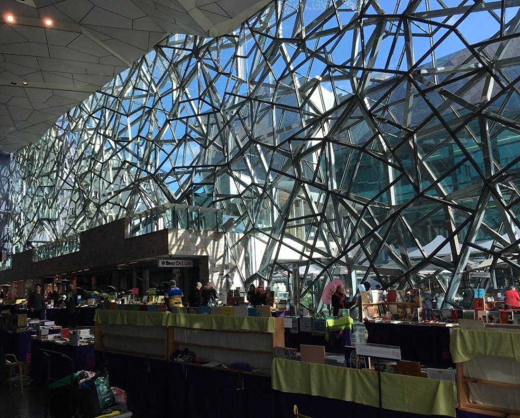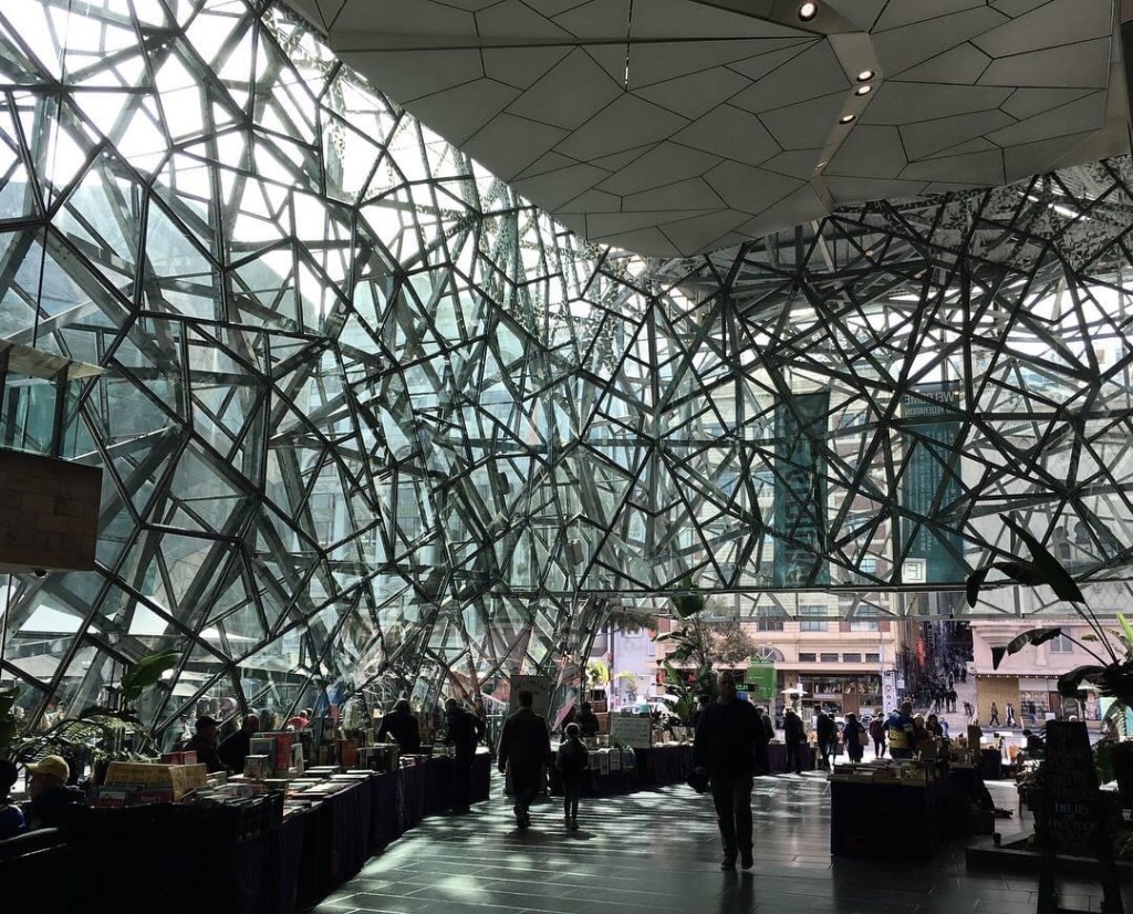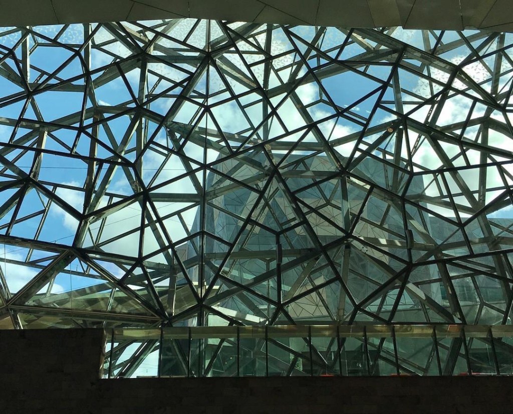 The Atrium, the best bit of #FedSquare by far. Such a mad #fractal spiderweb. An early example of computer aided engineering, creating an irregular space frame. But there’s rarely anything much in there (except the book fair) nor does it go through to anywhere in particular.