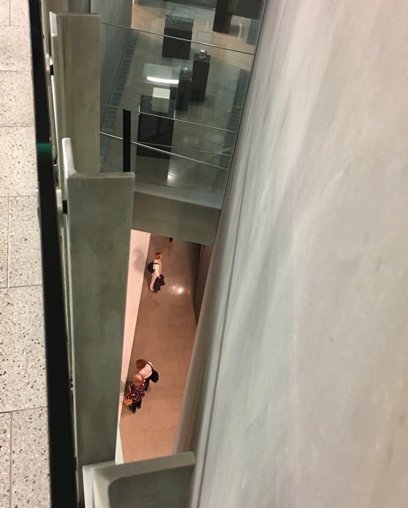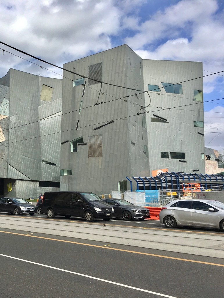 The eastern ‘shard’ at Federation Square, completed 2002, pics from 2017 and 2018. It’s a perfect evocation of ‘deconstructivism’, all wild angles, probably derived from complicated geometries of the site and sight lines. I like it! Though there’s nothing in it. This is the bit that’s most similar to the 1999 Berlin Jewish Museum. The unbuilt shard would have had more glass, I found some renders on my computer, don’t know the source, but must be much later than the 1996 design by @labarchitects. I’m not sure I wanted to see it built, it would have been a bit shouty, but the one level version built wasn’t great, and the replacement metro entry is just a glass box with a flattish roof, neither minimalist nor deconstructivist.
