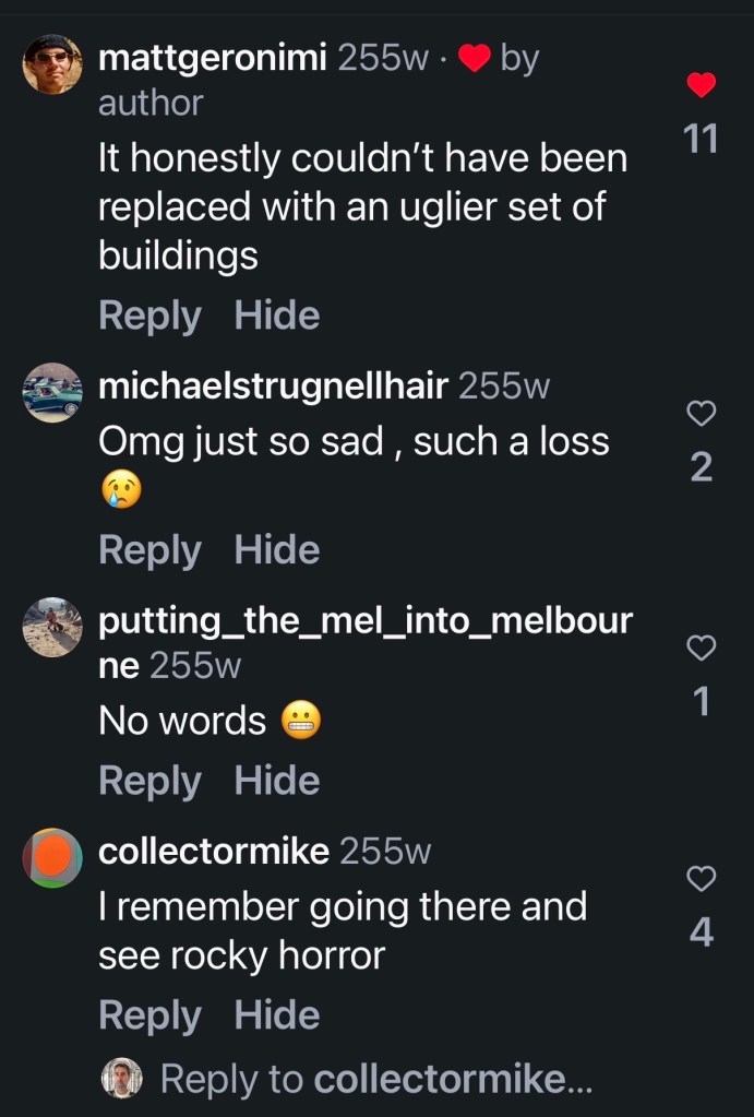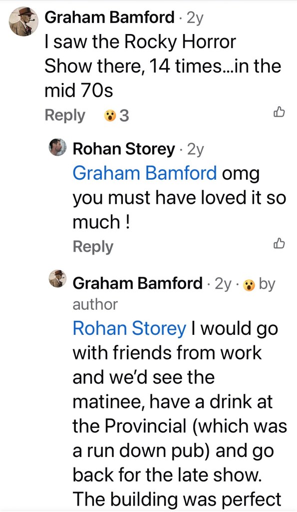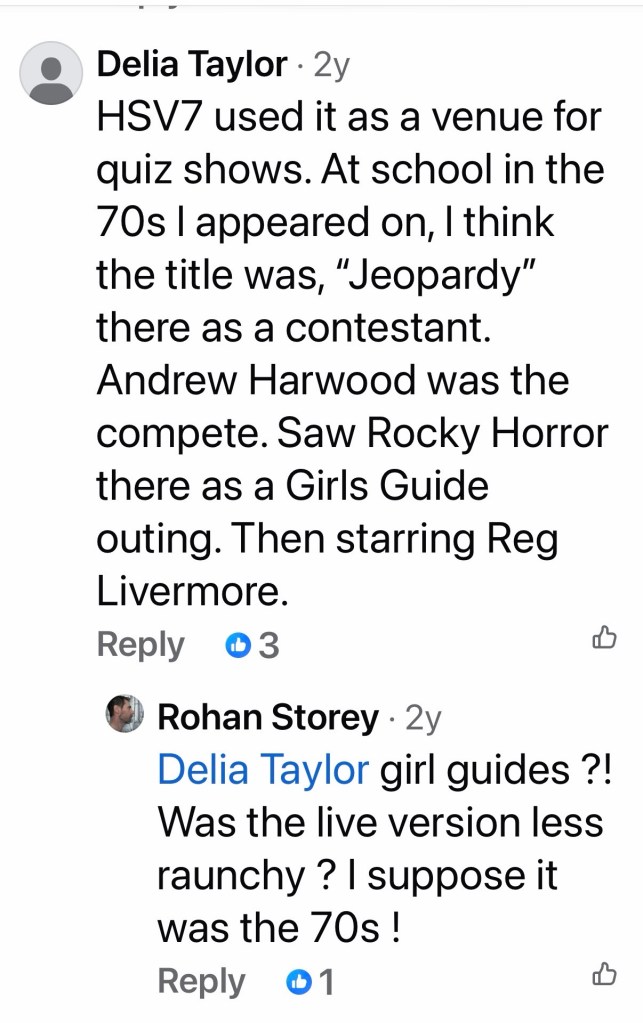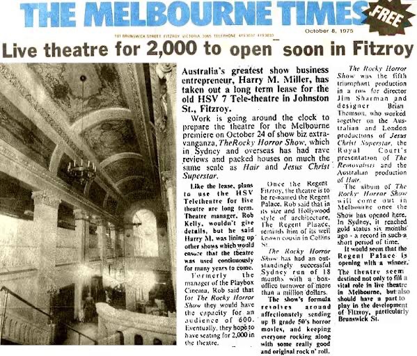 Built as the #HoytsRegent in Johnson Street Fitzroy just off Brunswick Street, it opened in 1931 as one of the largest suburban cinemas, seating 2000, and one of the most luxurious, with plenty of gilt, chandeliers, velvet drapes and a very grand lobby. An early victim of tv ( perhaps because it was so big) it closed in 1960, but then tv came to the rescue, and it became the HSV7 Teletheatre, where many shows were filmed with a live audience (of 4-700). That lasted till 1975, then it became the Melbourne home of #RockyHorror, going till May 1977.