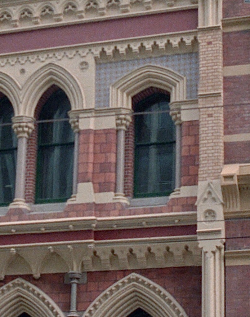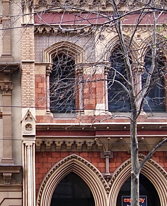 Closeups confirm contemporary reports that it’s made up of mostly #architecturalterracotta, in red and buff, along with red and grey granite columns, tuck pointed brickwork, and spandrels of patterned encaustic tiles – all very #highvictorian #gothicrevival. Designed by #TerryAndOakden, this is I think the most extensive use of terra cotta here in the late 19thC – it was very popular in the US, and the UK, but not here. In fact I can’t think of another Gothic Revival building that is quite so richly and densely coloured – but the other buildings in this group come close ! Might have been the work of #HHKemp who became a partner in 1888, or #PercyOakden, both not shy of new and rich effects. (Definitely not #LeonardTerry since he was dead by then).