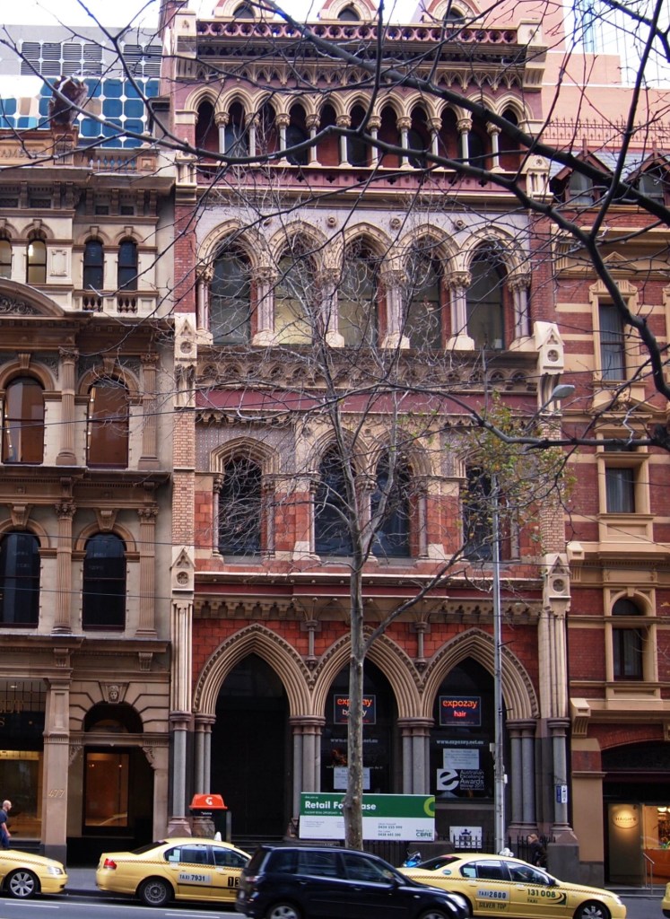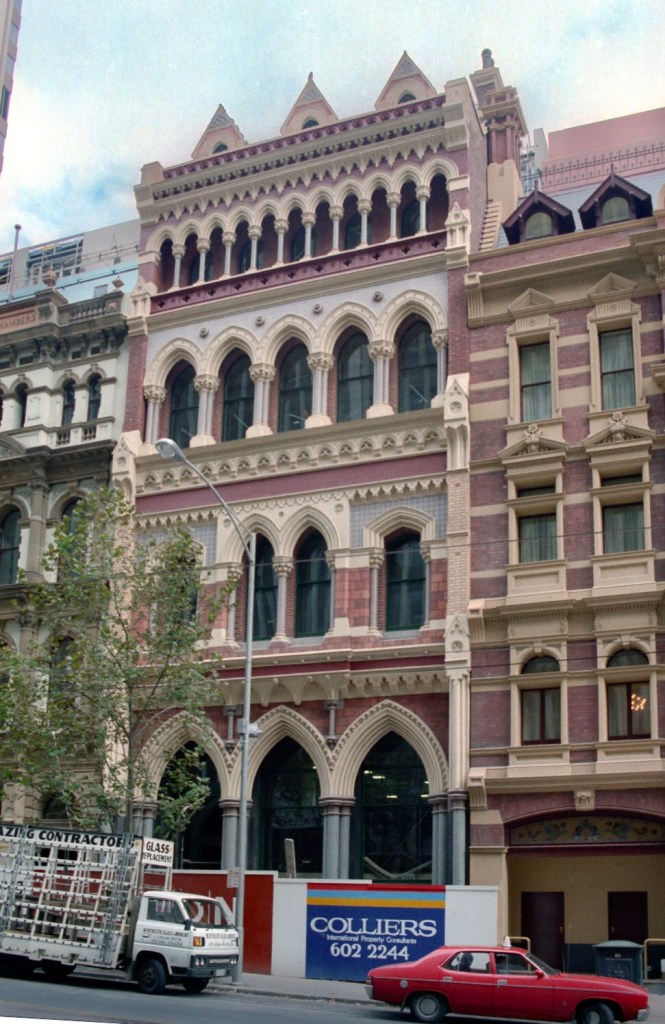 Excellent shot of the 1887 #NewZealandChambers one of the Rialto-Olderfleet group of buildings, from 1984, now with a #damntree in front. It was taken by Graeme Butler for the CBD heritage data sheets, when it had just been restored (and has just been done again by @lovellchen, at the same time the 1984 pomo 10 level DCM office block behind has been replaced by a 40 storey #Grimshaw one). 2nd is a more recent shot from WikimediaCommons.