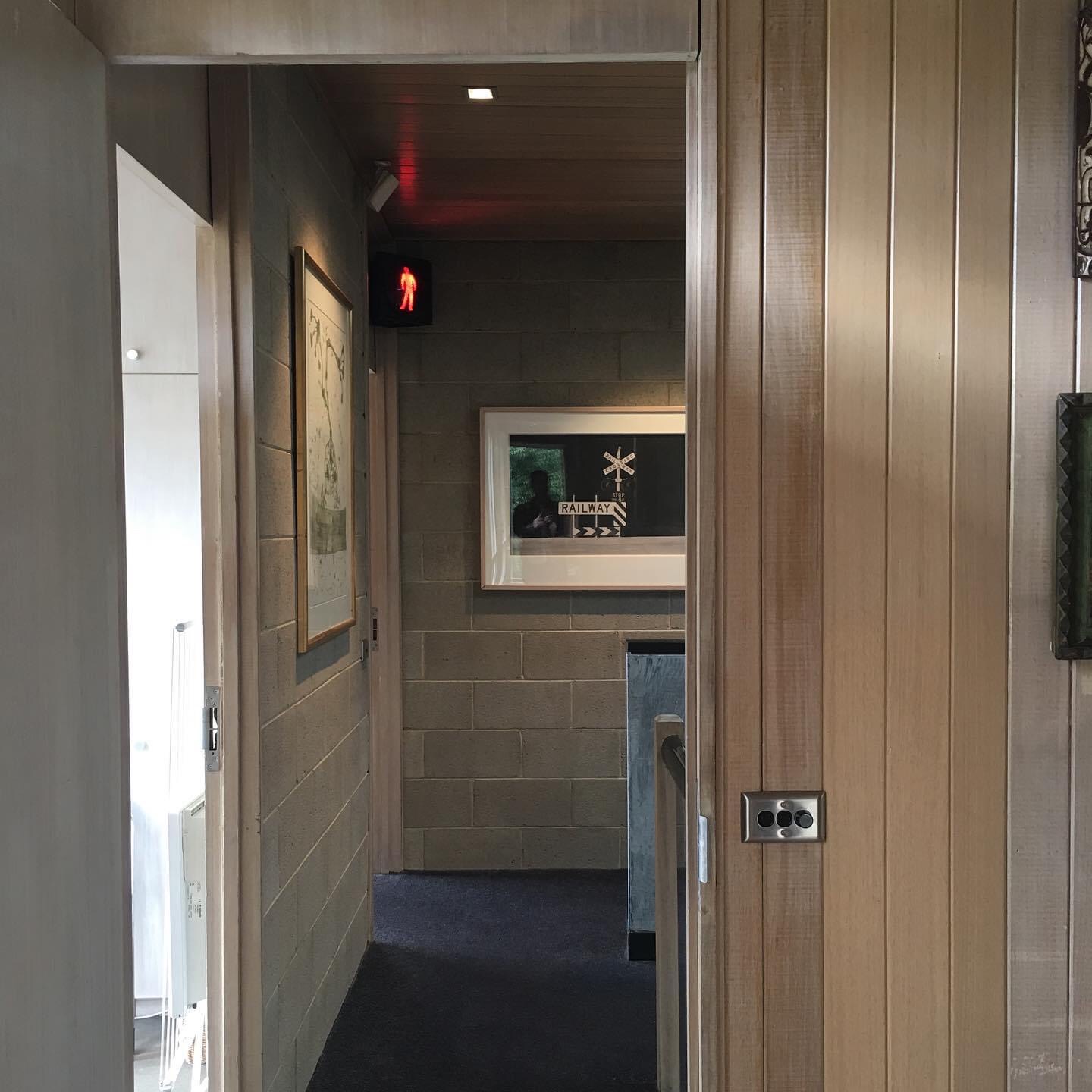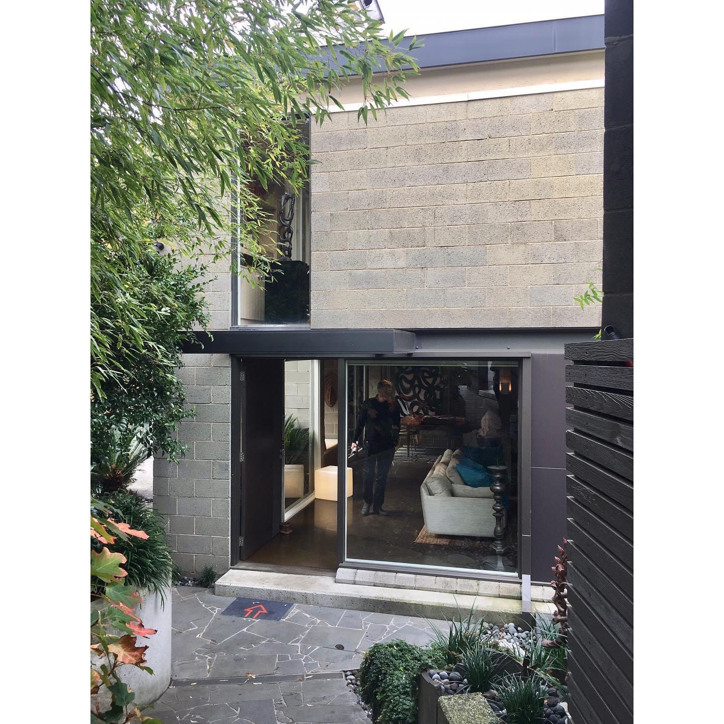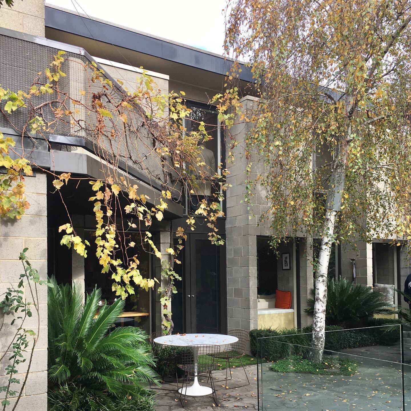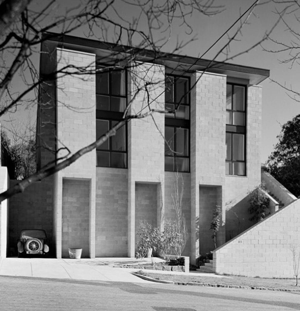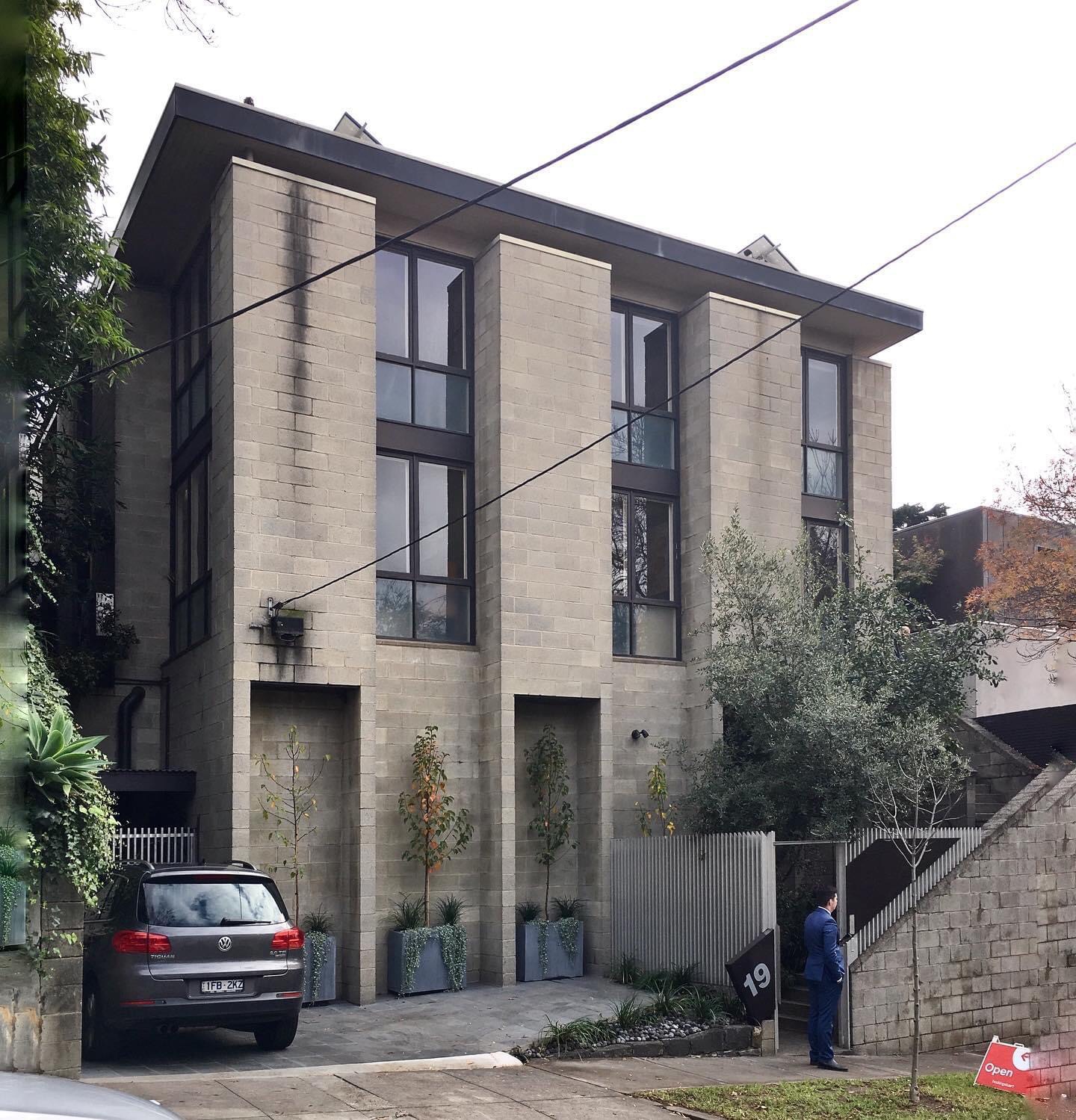 Some early #Brutalism – the #McNichollHouse, #SouthYarra, 1959-63, by Grounds & Boyd. Theres the Caroline Street side you mostly see in photos, I’ve always thought it looked like a block of flats, turns out to be the back, a stack of bedrooms, and it’s two storeys and gardens on the other side. Rather interesting but severe, vertical stacks of castle-like ins and outs, all in #concreteblock, very much a return to solidity after the structural experiments of the 50s. Designed it seems by #RoyGrounds, who did some more conc block houses in Canberra at the same time, but construction overseen by #RobinBoyd, c1962-3, about the time they fell out over the Arts Centre and Grounds left the partnership. It’s all charmingly nestled in planting on the Gordon Grove side, and cozy inside too, albeit extended and rearranged. The current lounge /dining was the carport (!), I think what’s now the master bed suite upstairs was the lounge/kitchen/dining. It’s been variously altered inside, all sympathetic (except the stair balustrade). Lots of conc block and pale timber walls and timber lined ceilings.