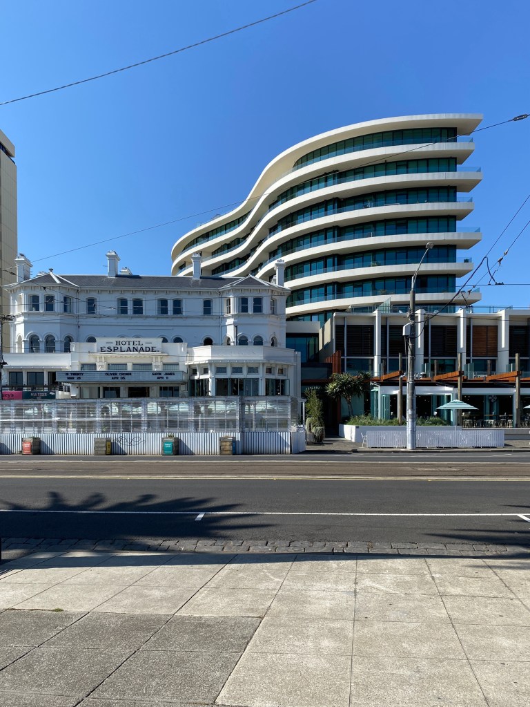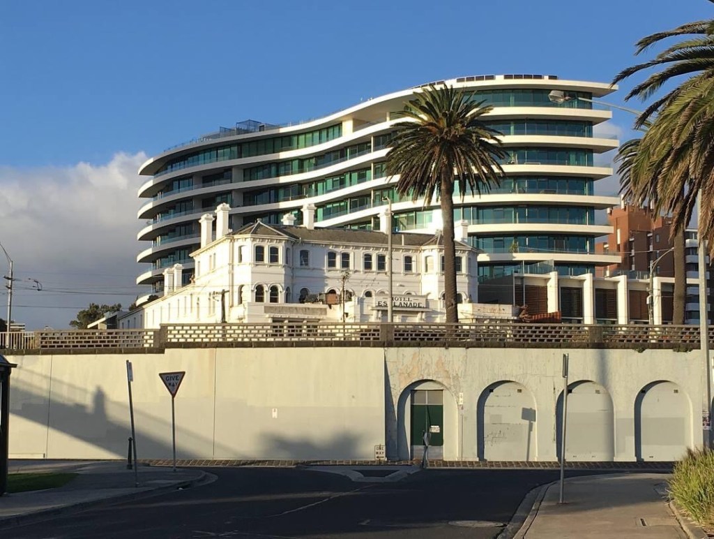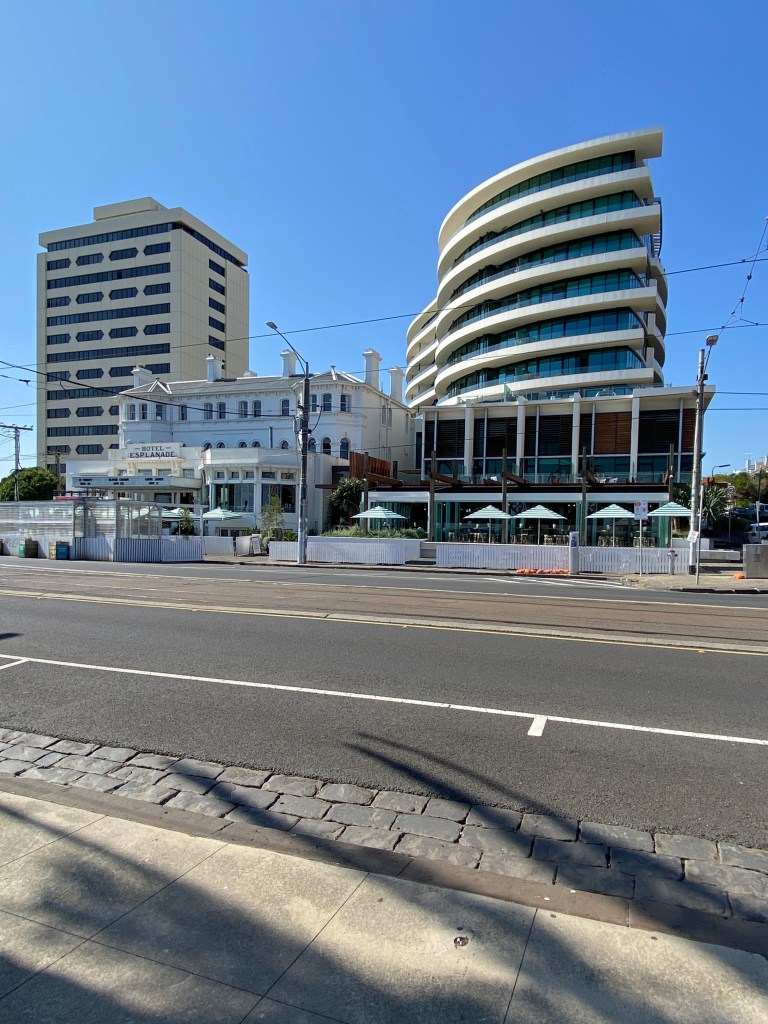 Repost this day 2018: #EsplanadeHotelStKilda, built 1878, designed by #SmithAndJohnson, as four grand terraces, which instead became a hotel, extended 1920s by #GibbsAndFinlay, when it was known as Carlyons, they had jazz out the back, 50 years later it was punk and alt live music powerhouse 80s – 90s, sold, a 35 storey tower proposed behind it caused a furore and this curved 10 storey thing by #FenderKatsalidis was the eventual compromise in 2005, hotel itself closed 2015 for a refurbishment which never happened, sold again last year by #SandHillRoad, being converted into 4 flours of bars and food venues with three live music stages, including the fab #GershwinRoom. Whew. Update : reopened Dec 2018, I got a snap during staff training.