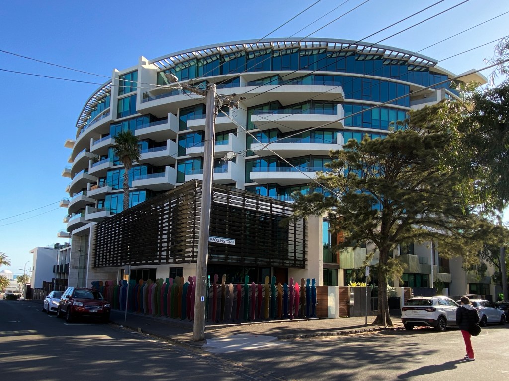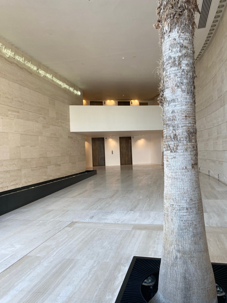 This post is about the big curved apartments behind the Esplanade Hotel. I’ve always been annoyed by it, rather dominating, and some nice Spanish style flats demolished for it, but it could have been much worse. It’s a compromise that was reached after a 35 storey tower was proposed in the 90s, with somewhat less of the hotel preserved, and no guarantees on its use. So a 10 storey limit was introduced, but over much of the site, so architects @fenderkatsalidis came up with this view catching curved thing running across, completed 2006. The back is much more glassy, and the entrance in the side street has a vast lobby with a palm tree sticking out ! (Update : the interiors, especially this lobby, were by Italian minimalist @claudiosilvestrin). The rear has townhouses at the base. So actually it’s not that bad, the white curves are almost a background, rather than ‘look at me’. The hotel carried on much as before, but closed in 2015, not reopening until Dec 2018, now an upmarket place, still with live music, but not the sticky carpet. And plastic walled booths along the street.