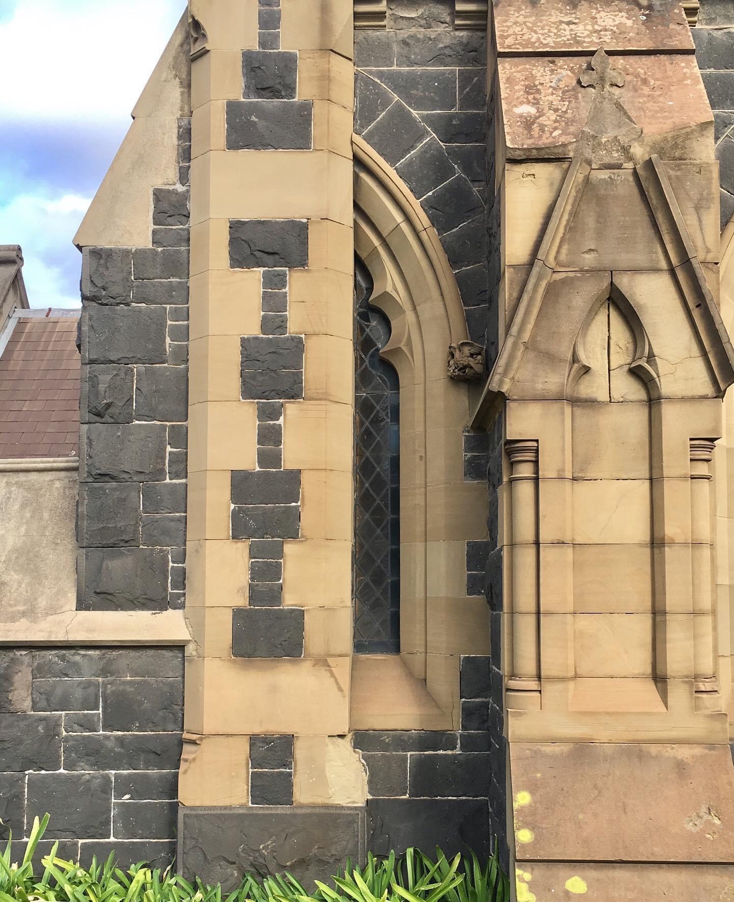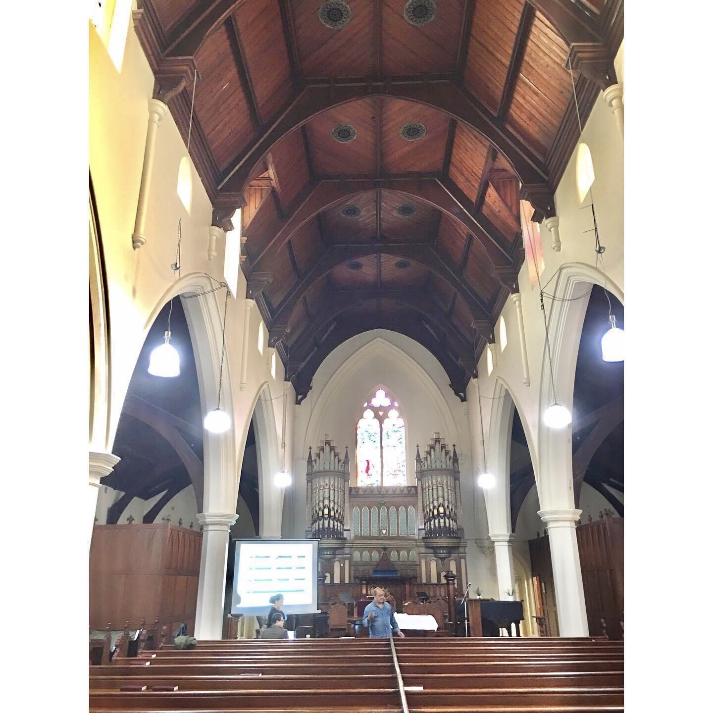 The #PresbyterianChurchSouthYarra just looks very unfinished from #PuntRoadTraffic, and it is, missing a huge spire, like so many churches, but also they stopped building 2 1/2 bays short, building 1/2 a window, very odd. Architect #LloydTayler, built 1865. That’s #BaraboolStone on the exterior, which turned out to be not very good. Great #dormerwindows, though hardly visible inside, as well as a great organ from 1887, right up front above the altar, instead of usual off to the side. Still a presy church, an islander looking congregation was setting up something while I was there.