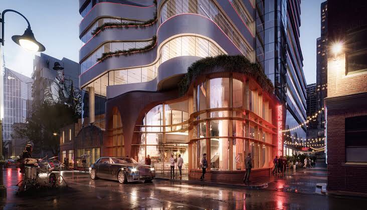 Here’s a pretty crazy one – an office tower for the corner of #LittleLonsdaleStreet and #BennettsLane, approved in 2019, is this convoluted shape so as not to overshadow the recently created green space behind the #WesleyChurch between 1 and 2pm. You’d think it wouldn’t be commercially viable, but apparently it’s ‘boutique’. There’s some rather altered warehouses and one old house/shop that they were just going to demolish, and soon after were proposed to be part of an expanded #heritageprecinct, so now they’re going to keep some facades – something not allowed in the new guidelines, so this is obviously a compromise. The warehouses are already facades, and the corner one will go, not sure how much of the house they’ll keep, or what’s left, or even how old it is.