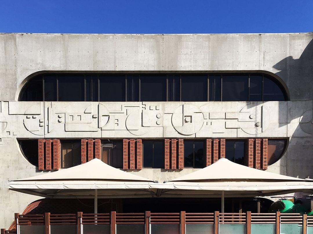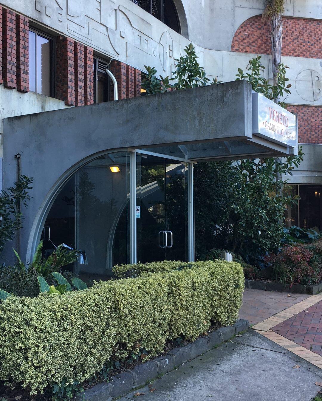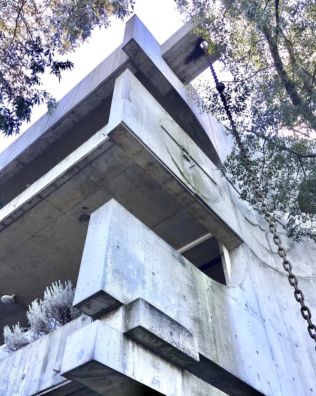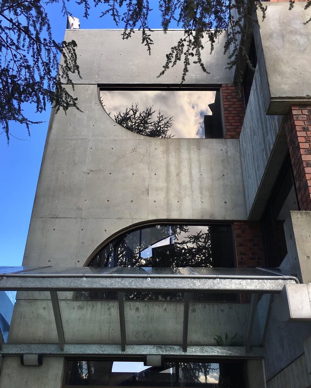 The simply wonderful 1972 #VenetoClub in Bulleen by Italian/Slovenian Australian architect #ErminSmrekar, whose work was quite outside the mainstream of Australian architecture in the 70s and early 80s. From the beginnings in the late 60s he showed a love of geometry like the quarter circle elements seen here, as a well as concrete cantilevers and 45* angled forms, and in this case geometric patterns worked right into the #offformconcrete beams. Decorative #brutalist ? And #chaindrains too, avoiding nasty downpipes. The most interesting bits of the club building are a bit obscured now, with a huge arched port cochere thing across the front, and big extensions out back, but there still plenty visible. The lift is quite #spaceage, but I’m told that was slotted in later within the spiral stairs.