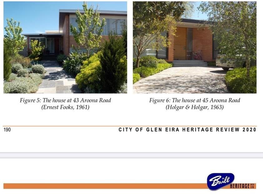 More #NorthCaulfield #midcenturymodernhomes up for #heritagelisting – a row of four at 43-49 #AroonaRoad. I’ve posted them right to left, starting with one I snapped in 2019 (but streetview is better), by #HolgarAndHolgar, 1971, love that whacky sculpted pillar. The row goes the Holgars, then Ernest Fooks, then Holgars and Fooks again – how about that ! From right to left, 1971, 62, 63, 61. The others I’ve just copied pics from the heritage study cos you can’t see much from the street, plus one old streetview of no 45.
