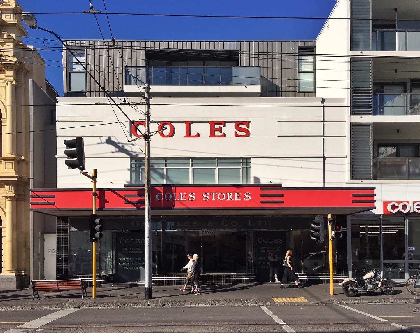 Not what it seems; this facade is a complete reconstruction too – quite unbelievable that the developers got a permit to not only demolish and rebuild this facade, but rebuild it 1.3m to the south so that they could squeeze in a fire exit. Originally built in 1936, designed by #HarryNorris (like most #ColesStores) it was called #ColesNo1Store, though that was actually a few blocks to the north- where #JGColes opened his first store with ‘nothing over a #shilling’ in 1914 (clearly based on the US Woolworths nothing over a dime model). By the 2000s the 30s one was pretty decrepit, which was probably how they got to do what they did. At least the rebuild is very well done, complete with (empty) shopfront. The development is by #JamArchitecture, part of the huge Banco thing called #SmithAndCo, completed in 2014. And it actually has a Coles supermarket !