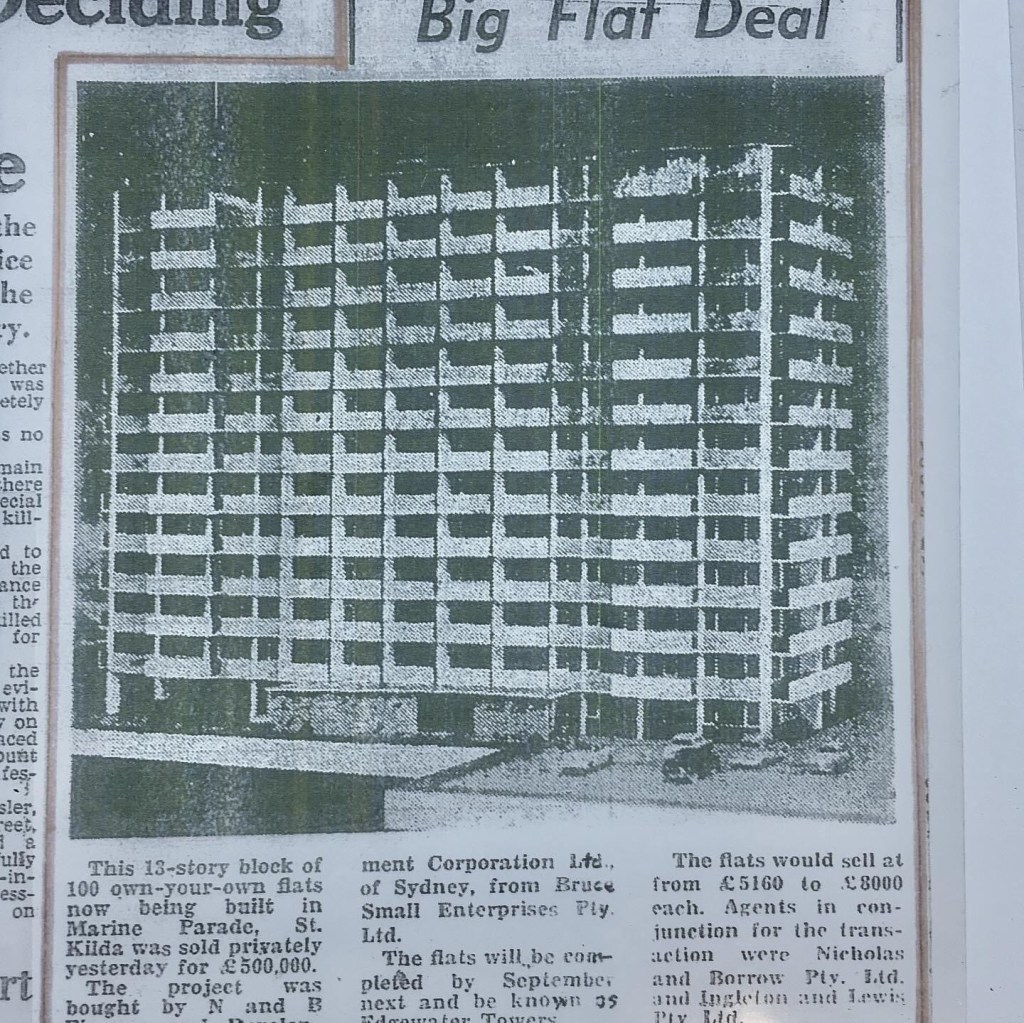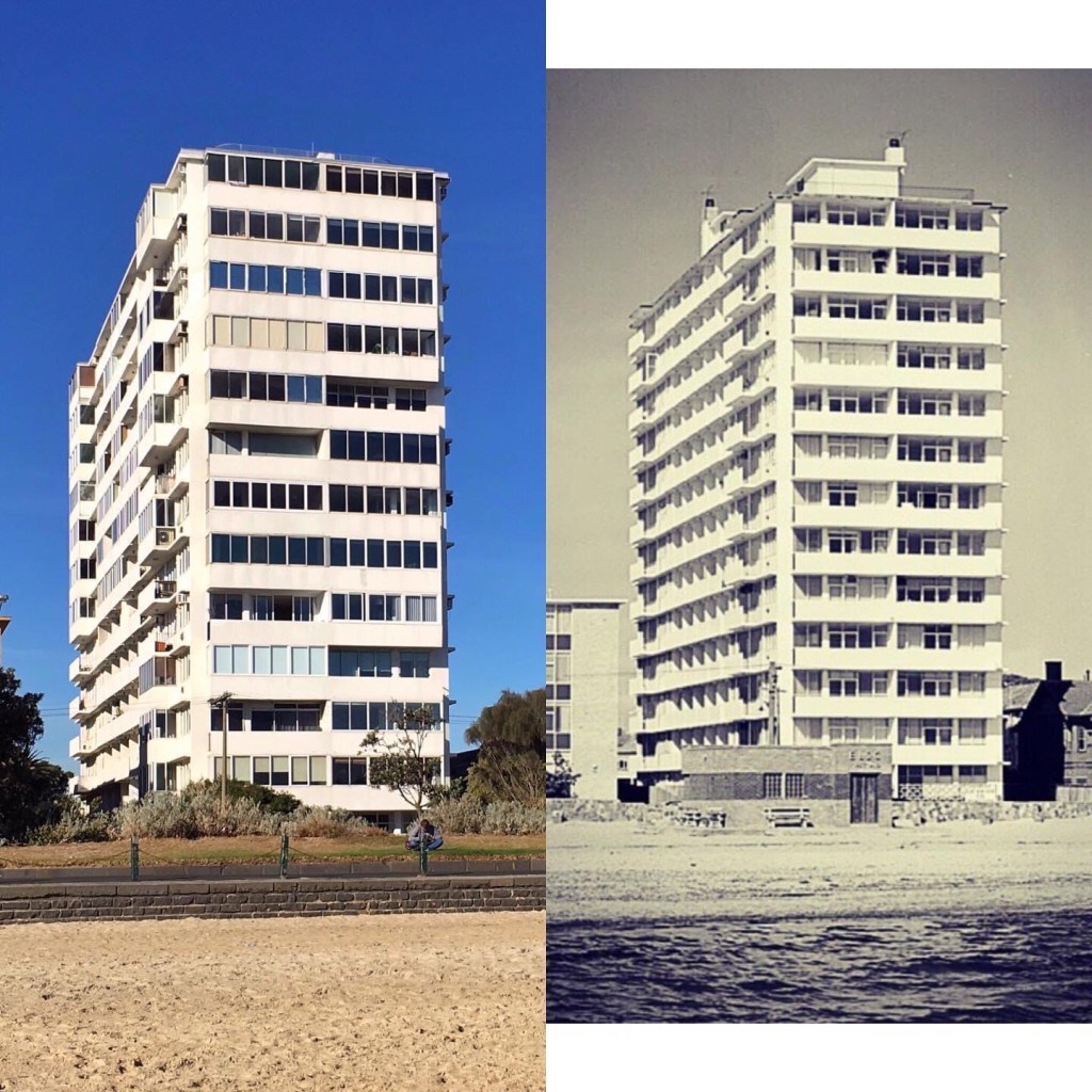 Architect #MordechaiBenshemesh. made quite a splash back in 1961, with #EdgewaterTowers, one of the first high rise apartment developments in #Melbourne, rather oddly located at the far end of #StKilda. But then seeing as it was part of Melbourne’s Jewish history, designed by and bought by postwar (and sometimes prewar) Jewish peeps, putting it in St Kilda within walking distance of #AclandStreet, then the most Jewish spot in the city, makes perfect sense.