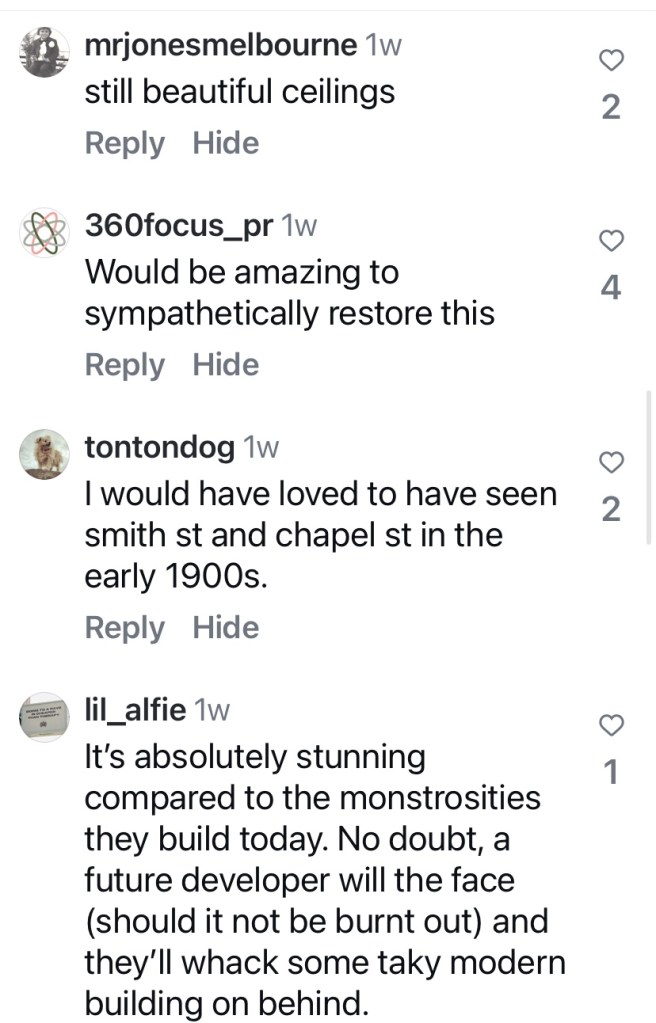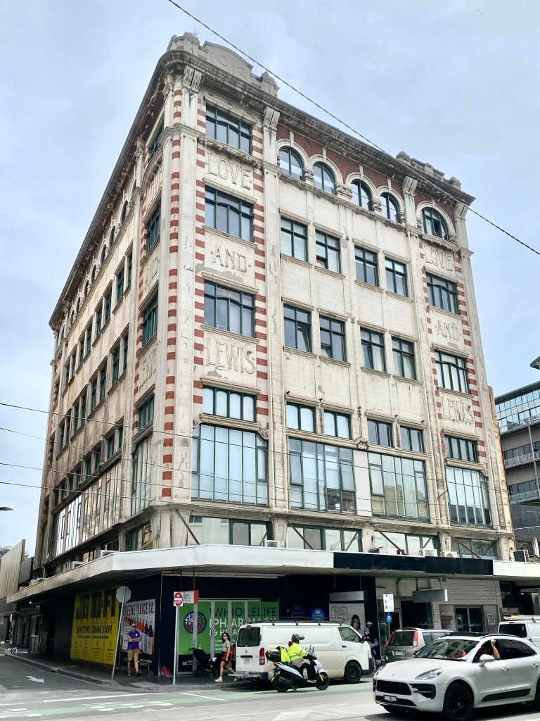 The other big ex-department store on Chapel Street, the delightfully named and cheerily designed Love & Lewis was built in 1913. @melbourne_ghostsigns has researched thoroughly, so I can tell you that the business started in Fitzroy in 1892, expanding here in 1897, and Bourke Street in 1902. Business went well in the boom years before WW1, so they replaced their 3 storey store with a 6 level one, built in record time, starting in January and opening in August. It was designed by A&K Henderson, with rather flat rendered facades, but enlivened by the blocks of brick up the corners and big Art Nouveau-ish letters (the render looks rather patchy, I guess they couldn’t match exactly). It’s also got very large windows, especially at the first floor, used as display, very modern really, all glass between the encased steel columns. The top two floors were workrooms, with a flat roof meant to be a roof garden. The store seems to have closed in 1941, and then had a variety of businesses; in the 90s I recall an art gallery and some avant guard fashion? Then in 2004 it was converted to apartments- I’d imagined it all as big spacious things, but seems it’s mostly small ones with mezzanines in each tall floor, and some look like they don’t have any real windows ? They added three floors on top as well, but set back far enough you don’t notice. B&W from @stonningtonlibraries, and last pic is the Bourke Street store, a much more exciting design by Nahum Barnet.