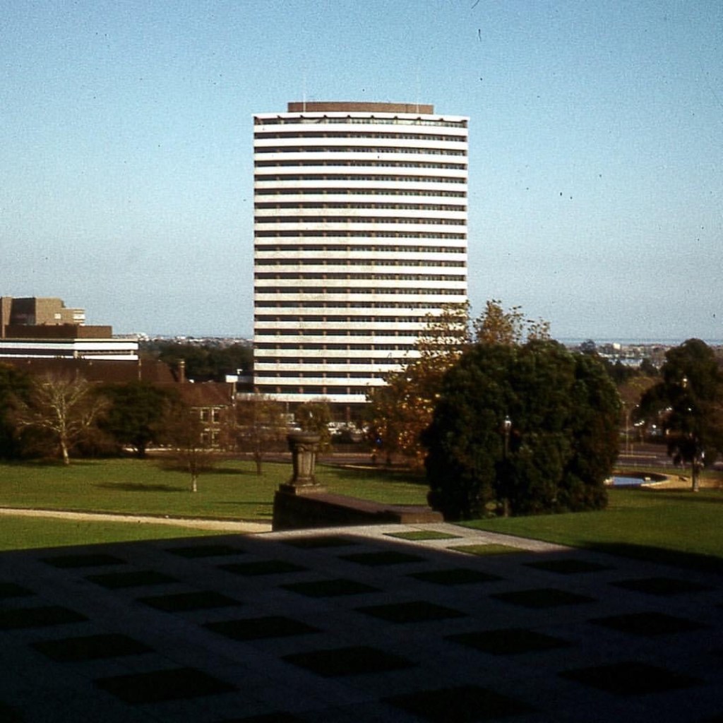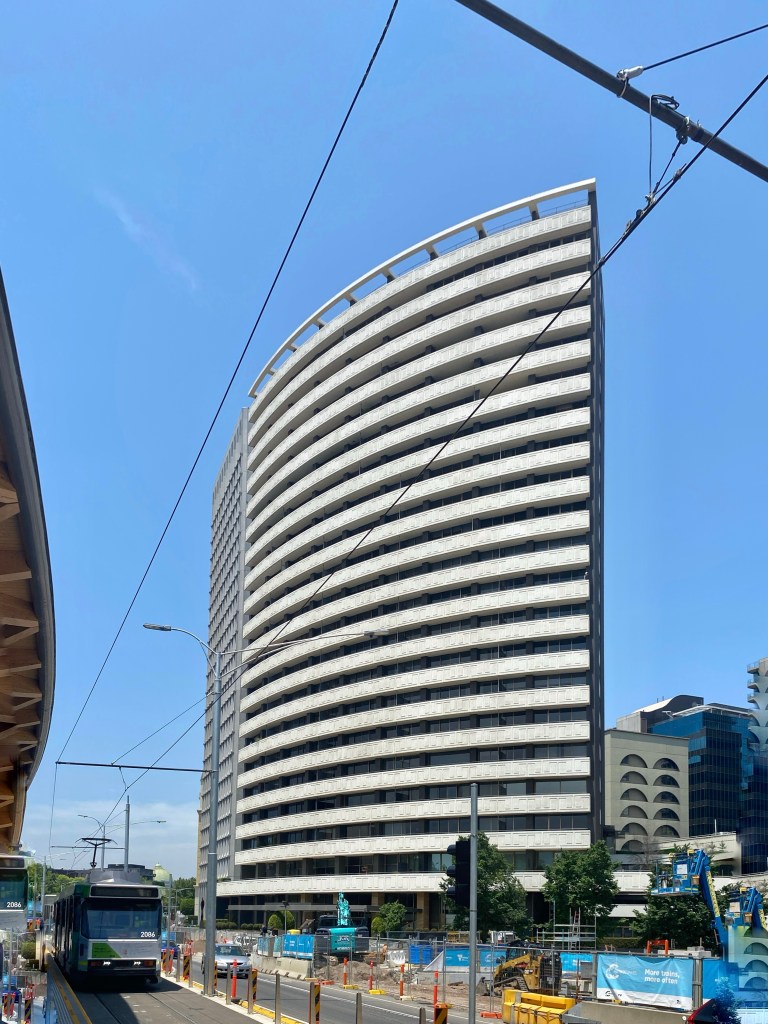 Former BP House, St. Kilda Rd, 1963-65 Demaine, Russell, Trundle, Armstrong & Orton. It was turned into luxe apartments in the 90s, called The Domain, in the process the brown brick sides and columns were rendered over, at first pale, now dark, so the effect from a distance is much the same. In 2017 I got a snap when the main elements went from beige to whitish, which is probably what they were originally. Quite a landmark when first built, though now tall buildings all round. And I wonder if the inhabitants havnt been really annoyed by the non stop construction in front.