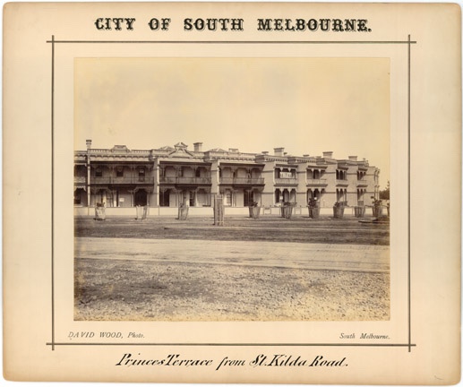 ‘Princes Terrace’ once stood on the curve of St Kilda Road round into Albert Road, built probably 1889. I think because of the odd shape of the lot (perhaps previously one house), they didn’t just follow the curve, they were all kind of wedge shaped, overlapping each other. The cast iron is rather elaborate, and there’s one big pediment, but apart from the curve effect, they’re not that remarkable. The first pic is 1955, the framed one is dated 1889, showing a whole lot of very young trees. It likely remained in one ownership, so BP could buy it in c1960 and take advantage of the newish commercial zoning of the street to go as high as they liked.