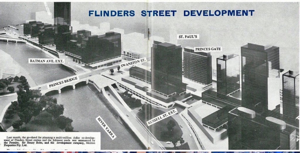 Eek just imagine ! From the #VictorianRailways newsletter April 1969. The plan was for tower blocks like the #GasAndFuelTowers to be built over all the Jolimont railyards and replacing #FlindersStreetStation ! The railways had control of the air space and didn’t need planning permission.