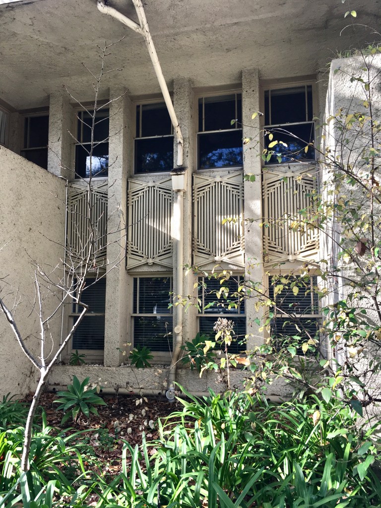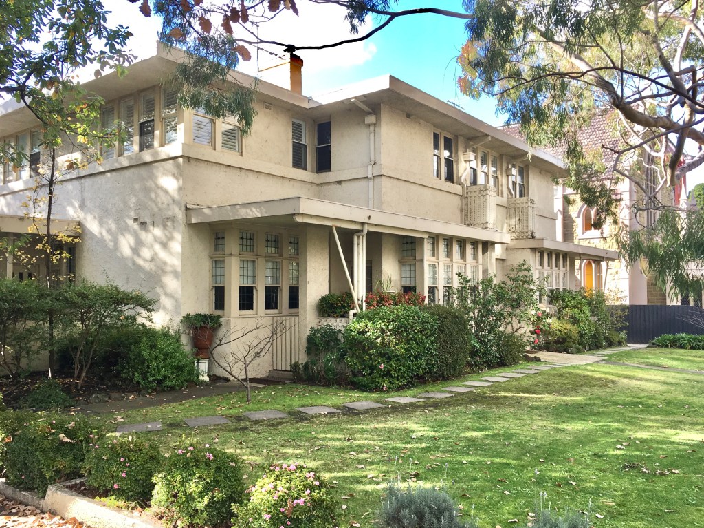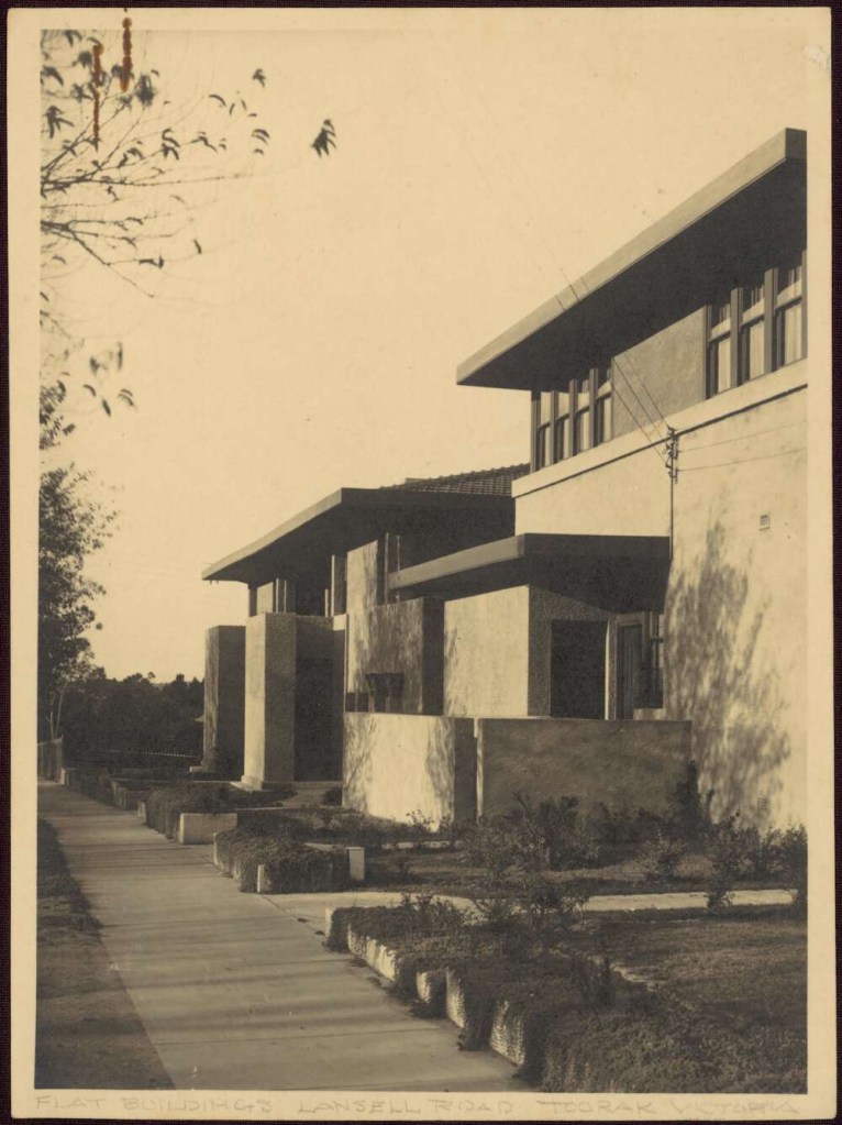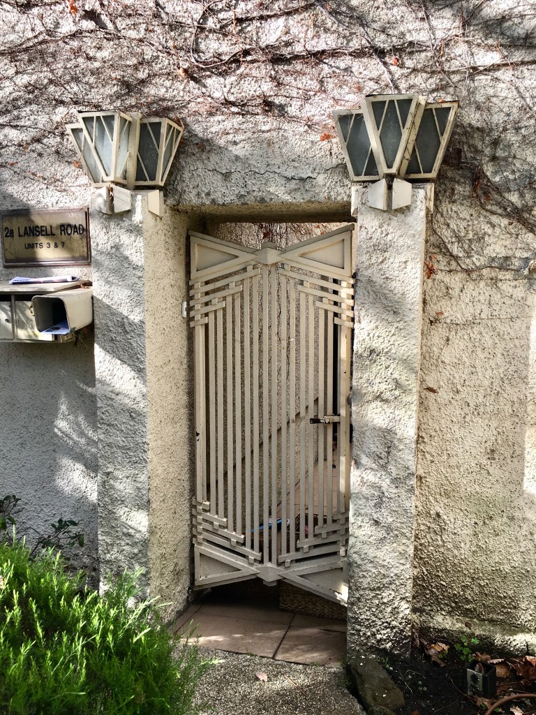 Right there on #ToorakRoad, there’s Langi Flats, a bit of Chicago 1900s #PrairieSchool, as interpreted by #WalterBurleyGriffin and #MarionMahonyGriffin in 1925-6. It was a rebuild of a 1915 house in front, and new build behind- that bit has plainer walls but more exciting geometric patterned gates and panels below the windows. The garden is very American, no fence at all, just lawn, and in a very unusual move for Melbourne, native lemon scented gums.