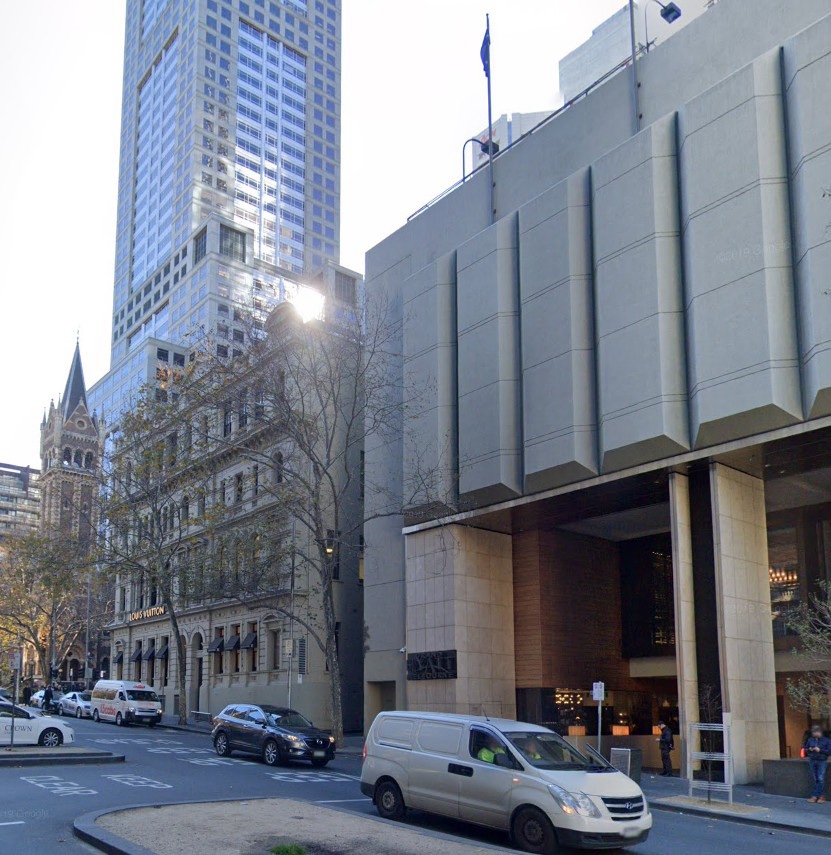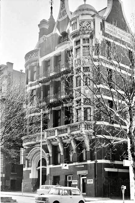 1st image colourised by folks on the Melbourne Through the Decades FB page, along with the original from Building Magazine in 1915. 3rd image is from @library_vic in c1970, last is the corner of the Hyatt entry where it once was.