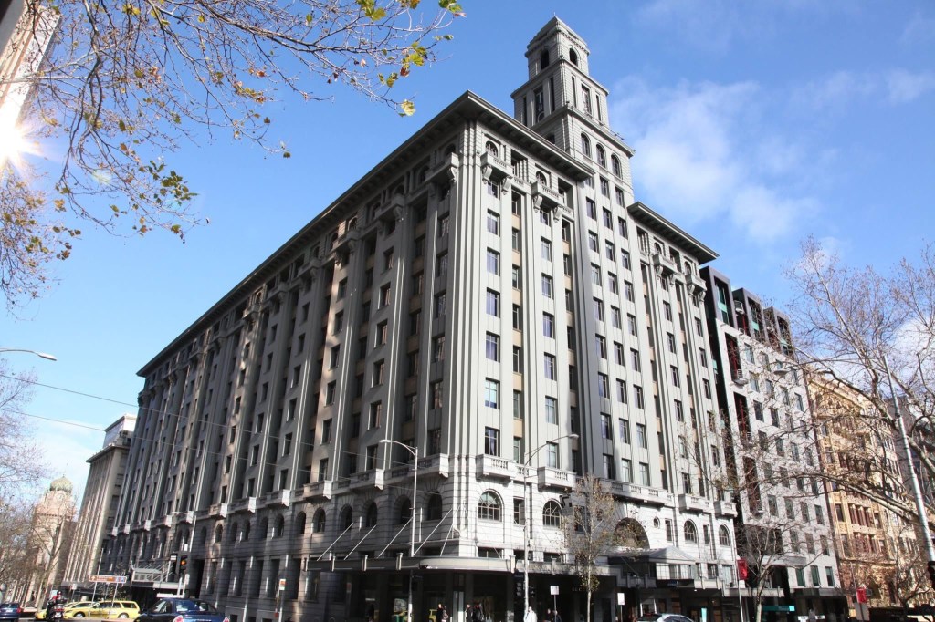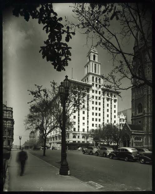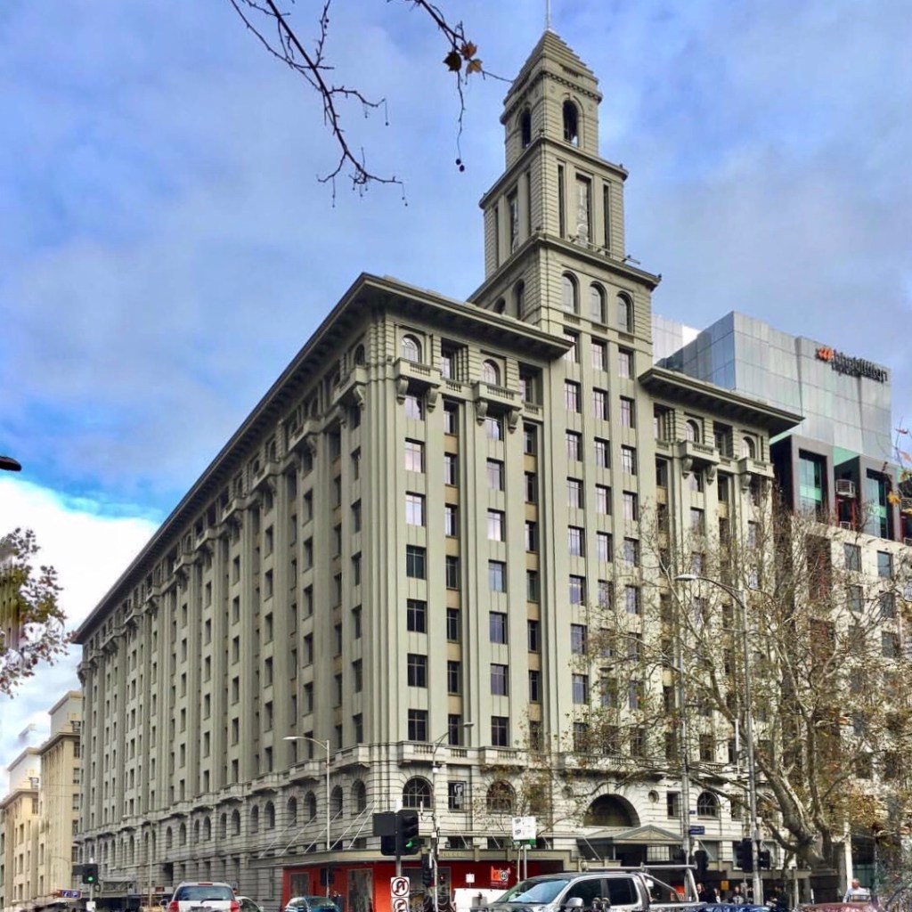 The grand #TandGBuilding, #CollinsStreet, #AandKHenderson, 1929, enlarged to the right and taller #tower 1939 (and to the rear in 1959). The largest #interwarmelbourne #officblock, the HQ for the once huge #TemperanceandGeneral Insurance business, with mini versions of this in capital cities and many smaller towns across Australia and New Zealand, almost all by the same architects.