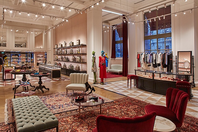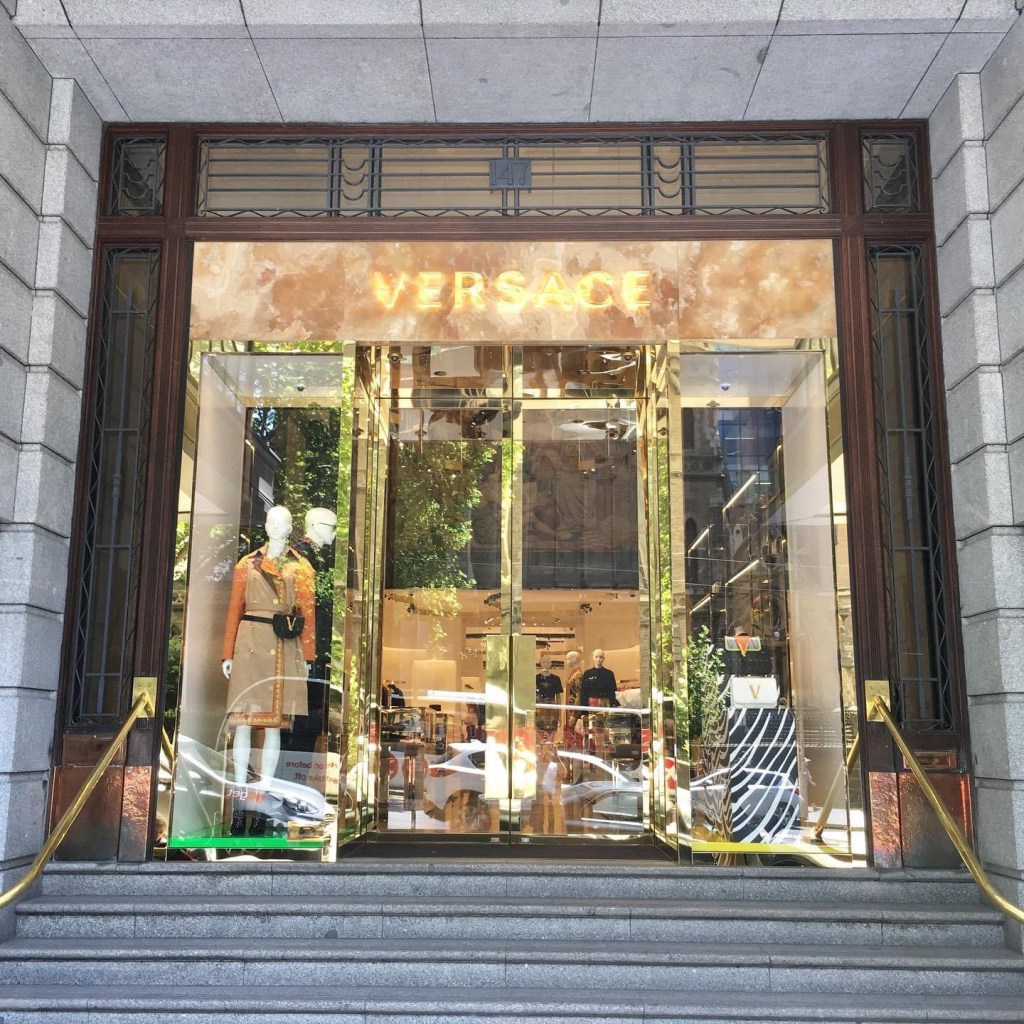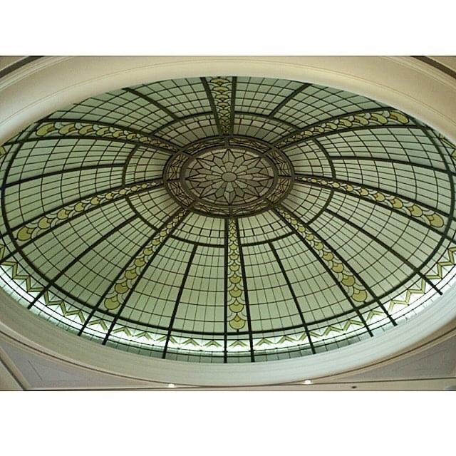 Update : nope, still grey. Also, the atrium with its curious glass blocks had a makeover, putting in some seats (nicer actually), but covering over the visible lift shafts – that was the best bit ! Rather shockingly the insurance hall with its glass dome disappeared inside Versace two years ago – hopefully just covered up ! (Update yes just covered up).