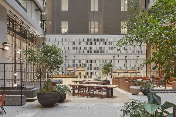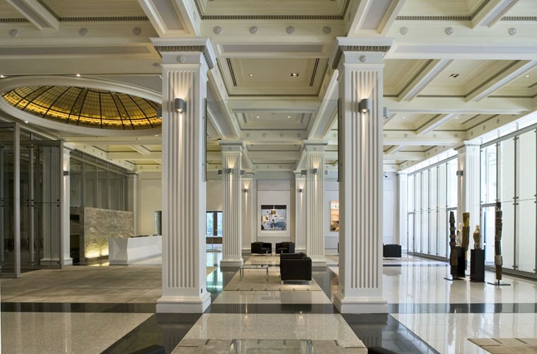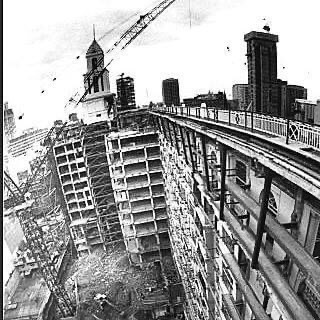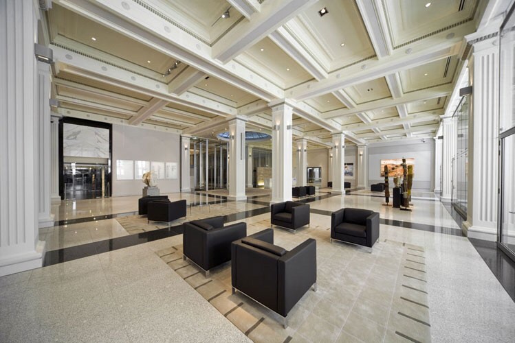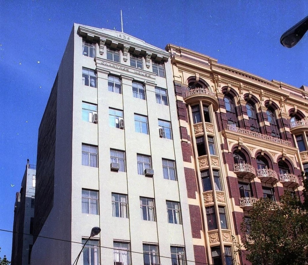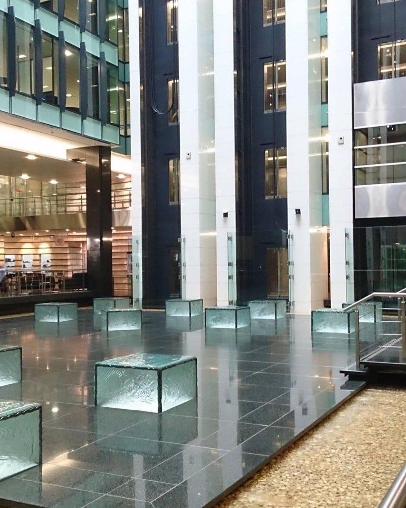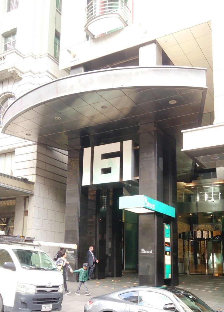 The resulting office complex, KPMG House, opened in 1991, was designed by Metier III architects. Its a sort of rectilinear postmodernism, with a dramatic atrium featuring exposed stainless steel lifts, and a floor with glass block cubes imprinted with various Melbourne landmarks.