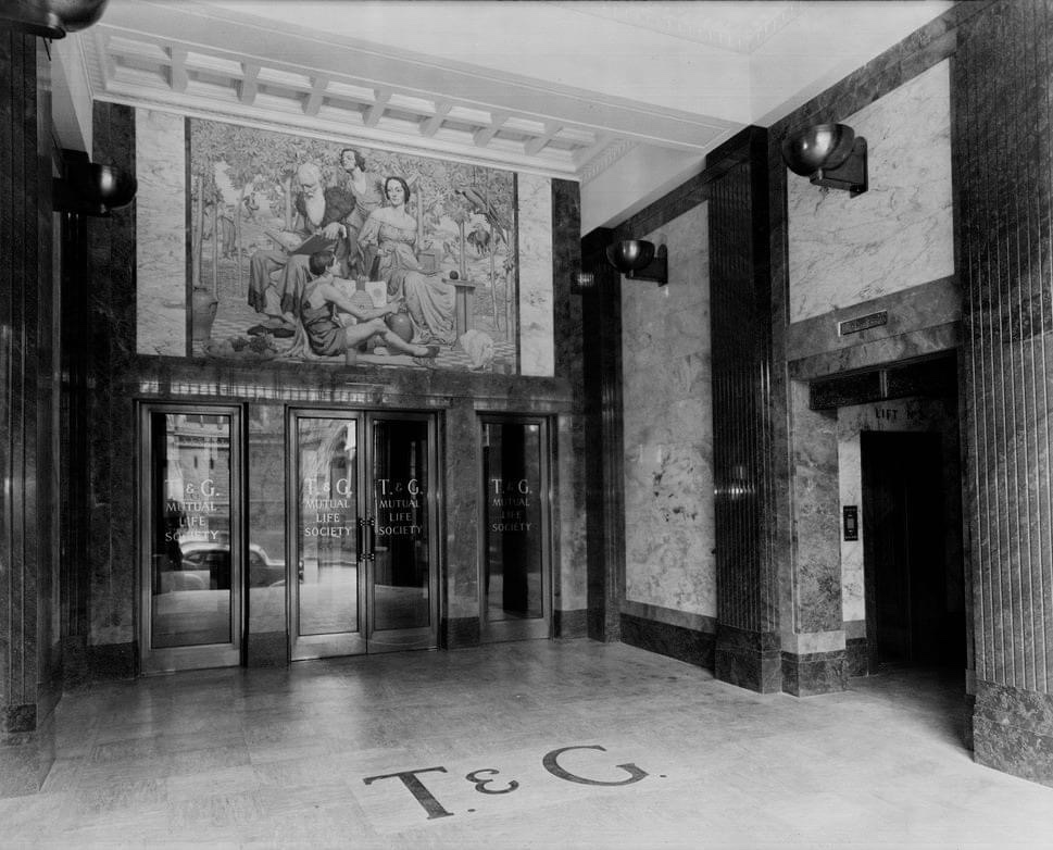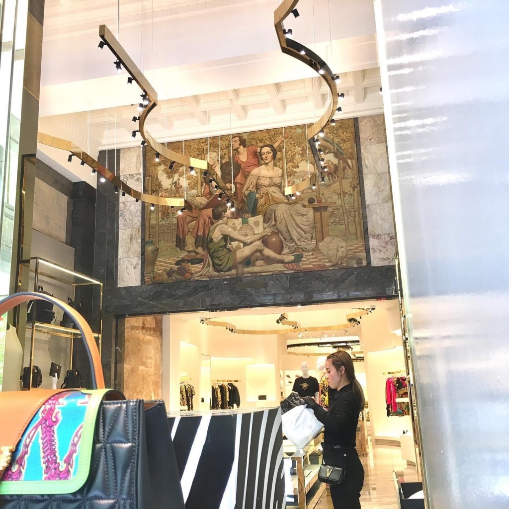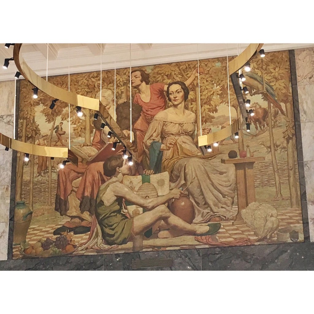 I was looking for something nice to post, but I found I had pics of this, which still makes me mad – this great 1928 mural (actually an oil painting) by #NapierWaller, tiled ‘better than to squander life’s gifts is to conserve them and ensure a fearless future’, graces/d the vestibule of the grand #TandGbuilding in #CollinsStreet, and was open to the street for everyone to enjoy – but in 2018 they somehow got a permit to turn that area into shop, and plonk display cases on the boundary, so now you have to look hard to see it, and there’s lights in the way. I never did get a satisfactory answer from the @cityofmelbourne how that happened, except maybe it was because it was an ‘interior’ (which it wasn’t before they put the doors on) and so heritage listing didn’t apply. 🙄 Hardly any fuss at the time from memory either, lost in the unbridled joy of having a new Versace store. @ Versace