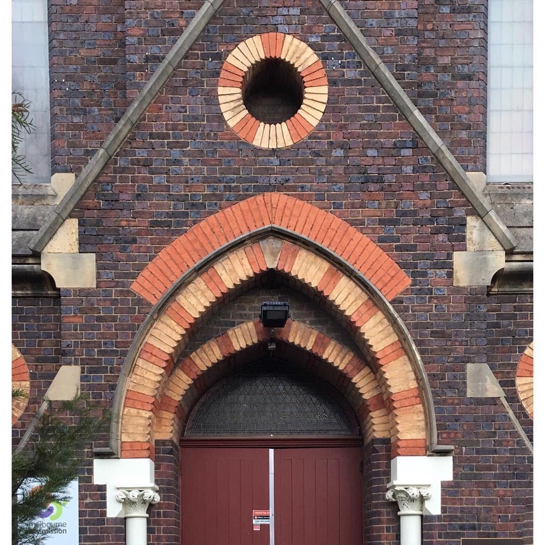 Repost this day 2018: #PolychromeBrick – how to do a lot with a little. A hall-like church with a lot going on in just the front wall; various elements thrust forward slightly, and outlined in special notched #voussoir bricks in two colours, and two different arches too. #MethodistChurch in #NicholsonStreet #NorthFitzroy, built 1874, designed by #TerryandOakden, part of a trend in the early 1870s from two colour brickwork to full-on polychrome #GothicRevival, carrying on the pioneering work of Joseph Reed’s Independent Church (now St Michaels Collins Street), 1866-7.